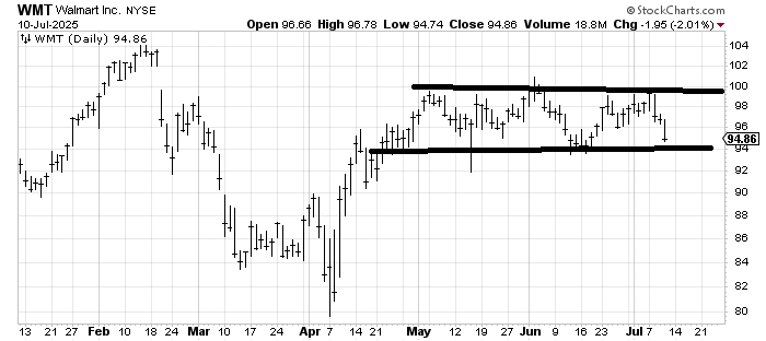 An example of a stock that threatened to break in mid-June is Walmart (WMT). It has been my contention, since May, that this stock looks to be in a trading range between 95-100, which so far has been the case.