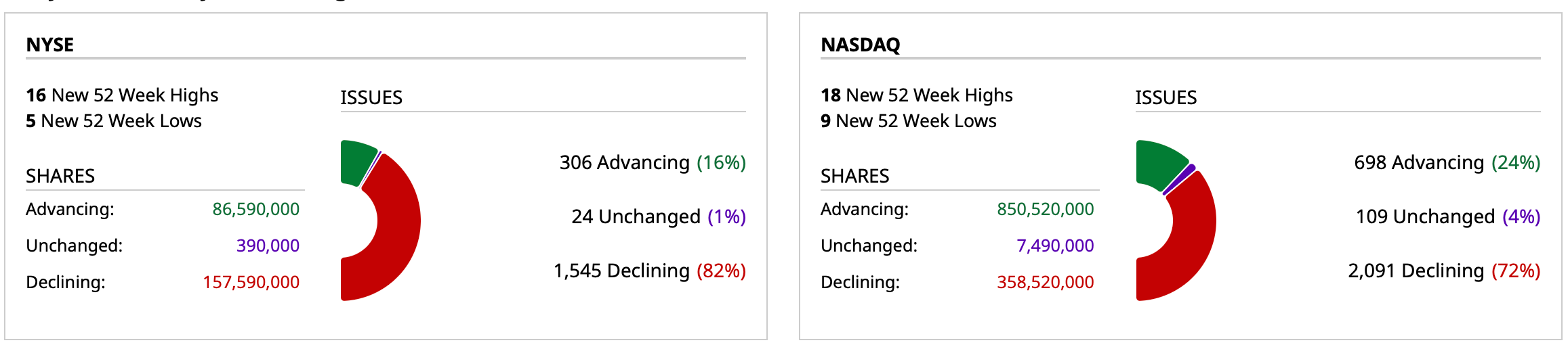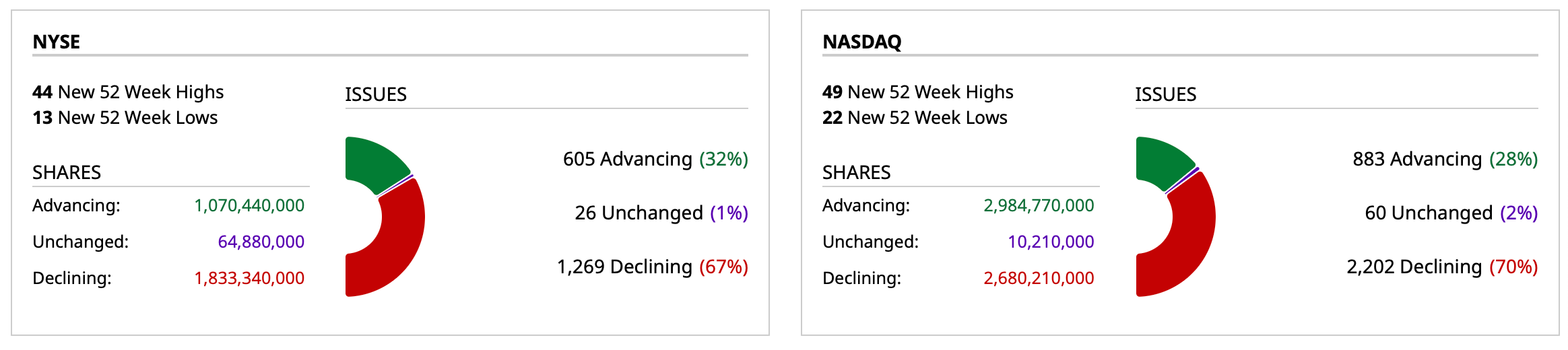 Breadth stinks up the joint - with NYSE 5-1 negative and Nasdaq 3-1 negative .