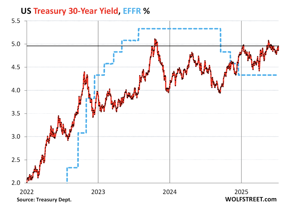 The 30-year Treasury yield (now back to late January 2025 when equities topped) is a thermometer of the bond market’s current fears about:
