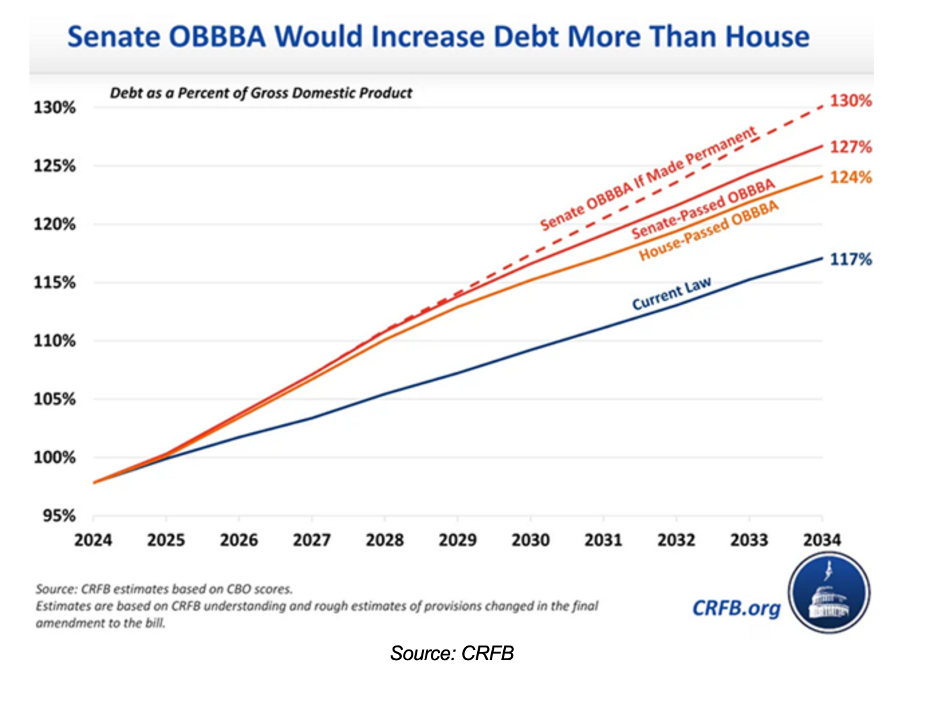 Going into this year, CRFB estimated the federal debt would grow to 117% of GDP by 2034, assuming current law (including expiration of the 2017 tax cuts) remained in place. The OBBBA law as passed by the House would have increased this to 124%.