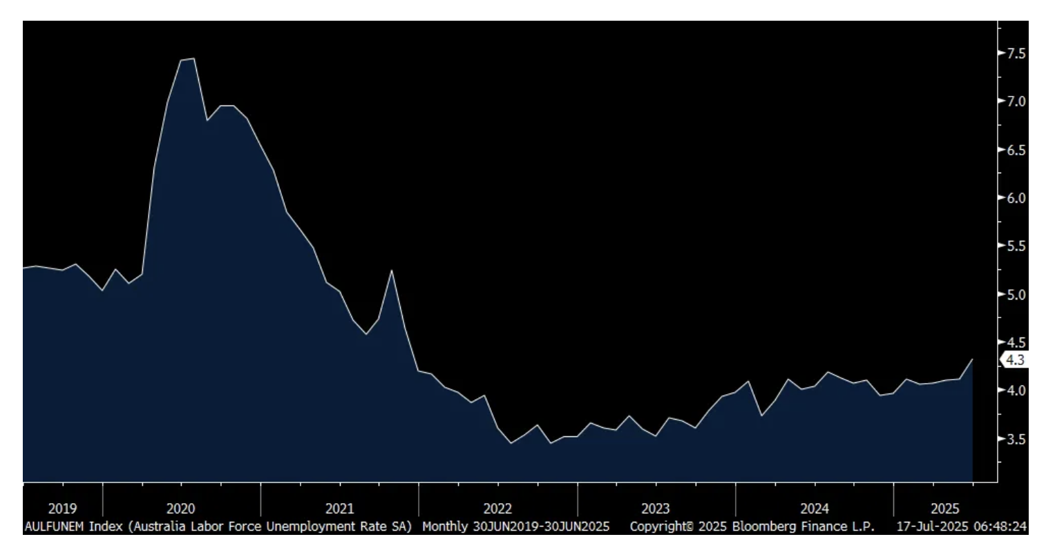 The June unemployment rate in Australia rose to 4.3% from 4.1% and that is the highest since November 2021.