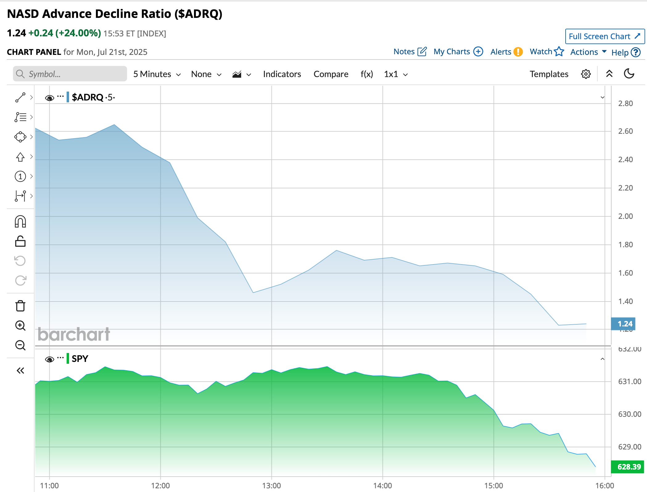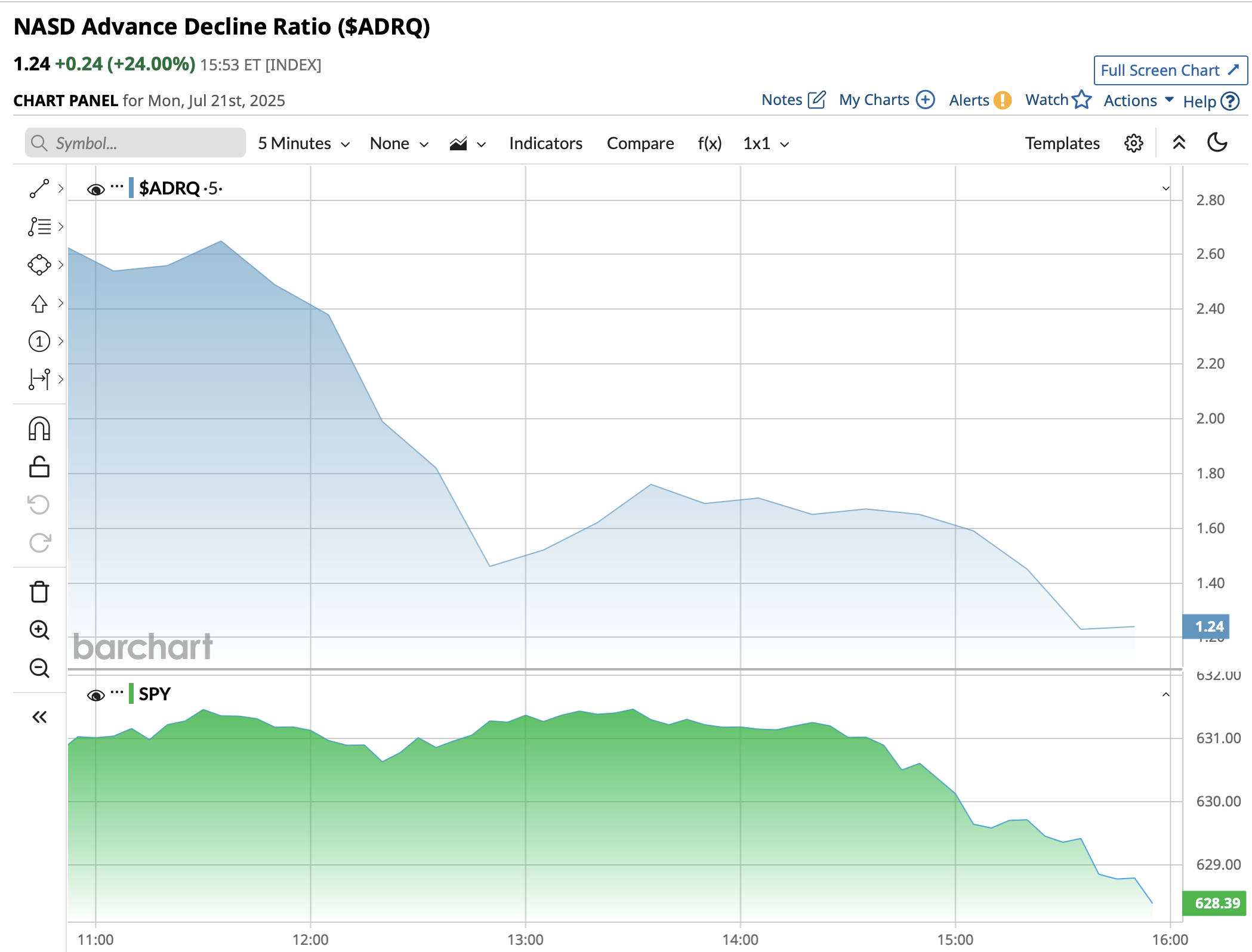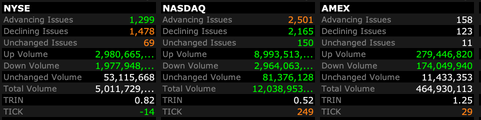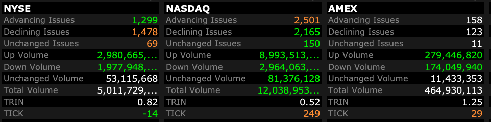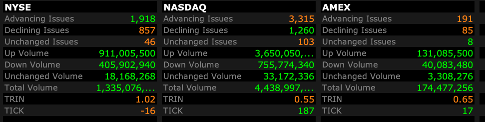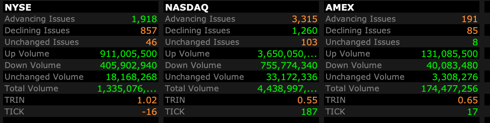 - Nasdaq volume 35% above its one-month average;