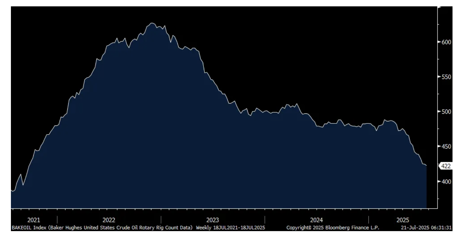 I'll continue to argue for a bottoming process taking place with crude oil prices. The US crude oil rig count as of 7/18 fell for the 12th straight week and by another 2 to 422 and has fallen by 53 over these three weeks. That's the least since September 2021.
