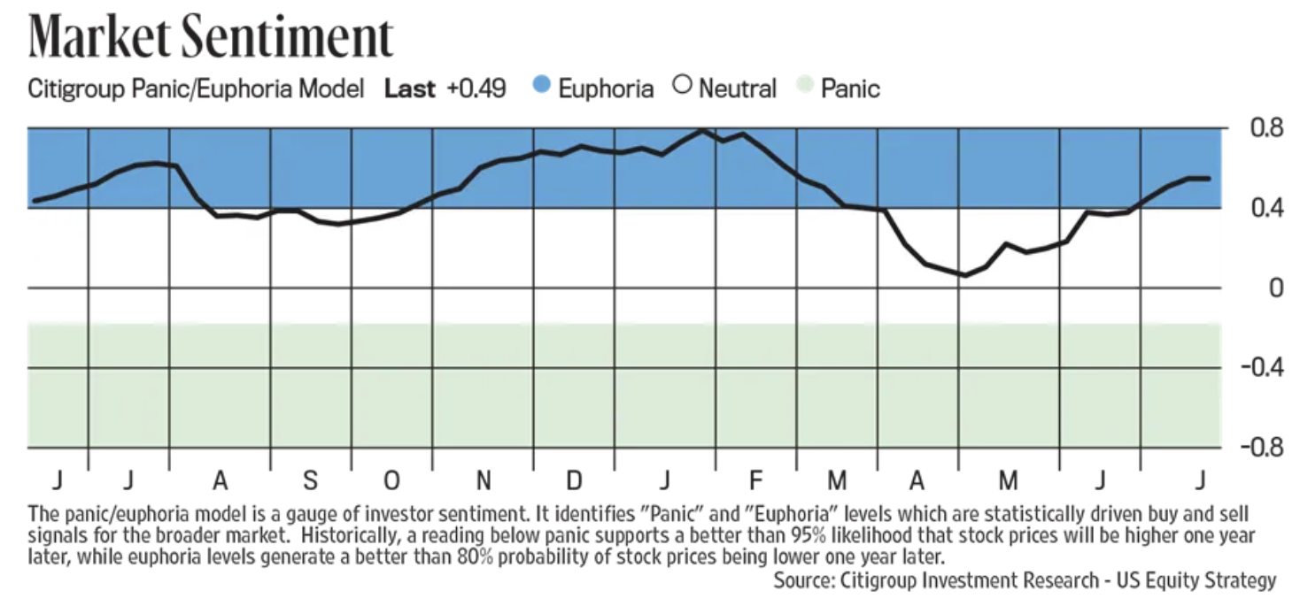 Finally, on stock market sentiment. The Citi Panic/Euphoria index moved further into Euphoria at .49, the highest since early March. Last week the Investors Intelligence got further stretched with a Bull/Bear spread now at 33.9 with Bulls at 54.7 vs 53.8 in the week before while Bears slipped to 20.8 from 21.2. I consider a spread of 40 to be extreme. The AAII retail investor survey continues to be more neutral with Bulls at 39.3 vs Bears at 39. The CNN Fear/Greed index is at 75, right on the dividing line between 'Greed' and 'Extreme Greed.' The NAAIM Exposure Index was 83.7 last week, off its nearly 100 print of a few weeks ago but elevated.