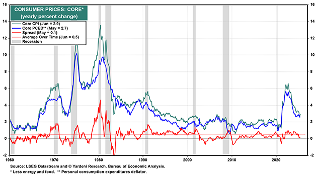 “Today's CPI report for June suggests that consumer price inflation is no longer declining toward the Fed's 2.0% target. Instead, it might continue to hover around 3.0% for a while as it has recently (chart). Trump's tariffs may be a contributing factor, though their impact remains debated. The core CPI inflation rate upticked to 2.9% last month, hinting that the core PCED inflation rate (at 2.7% in May) might have followed a similar trend.