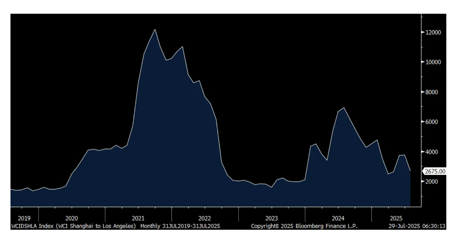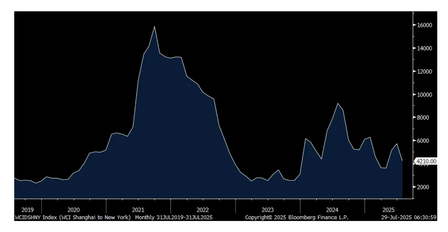 After the rush to order goods to front run tariffs, the cost of procuring containers has cooled as of Friday. The Shanghai to LA trip now cost $2,675, down $142 w/o/w and almost back to where it was in late March before the April 2nd tariff day. The Shanghai to NY has had a similar trajectory and with its cost at $4,210, down $329 w/o/w.
