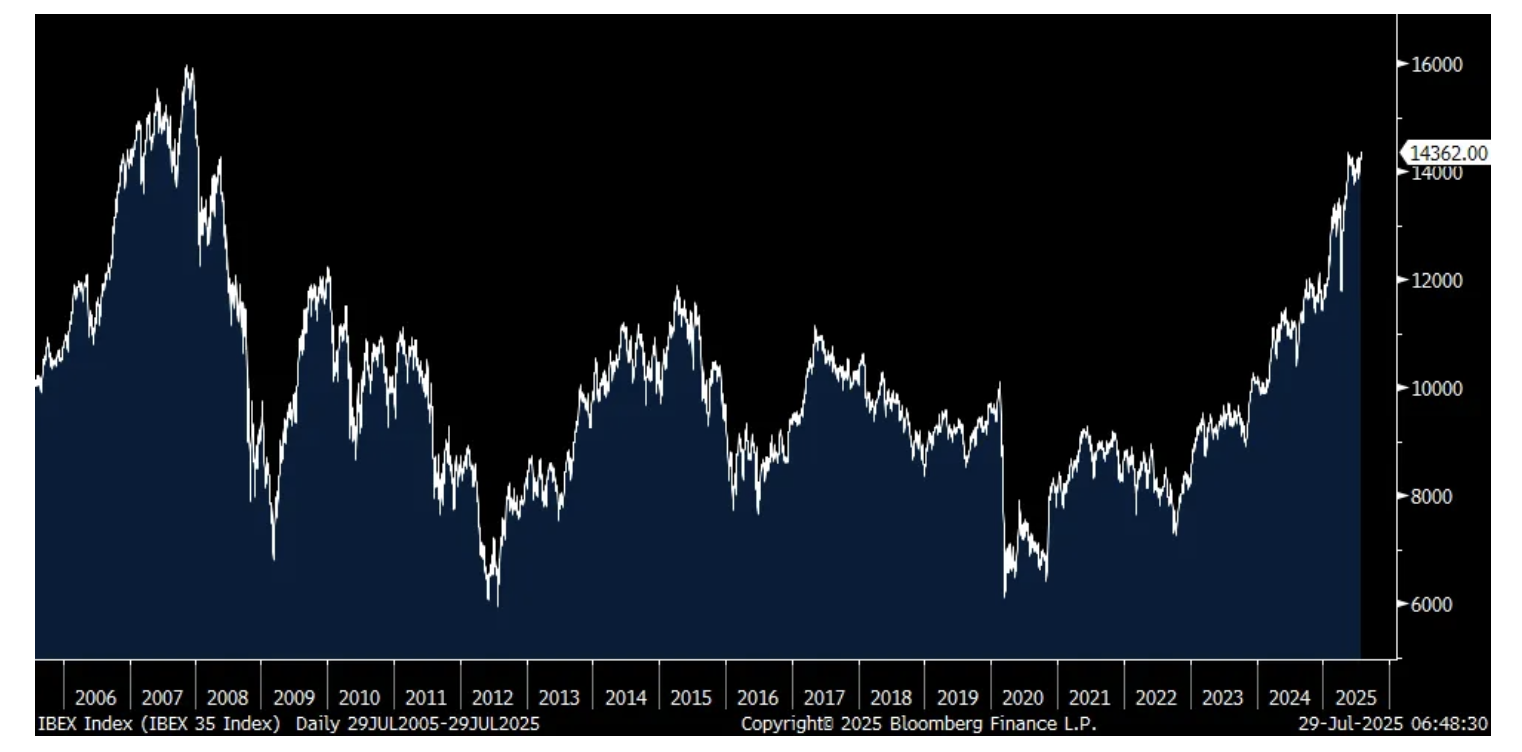 Spain continues to be an economic standout in Europe as its economy grew by 2.8% y/o/y in Q2, above the estimate of 2.5% and the same pace seen in Q1. This is more than double total growth for the Eurozone. Helping is that the economy is not that reliant on global trade and manufacturing compared with some of its regional peers and is benefiting from tourism and its service sector. The Spanish IBEX is up 1% today and by 24% ytd and by 38% in dollar terms. Amazingly though, it's still trading below its 2007 peak.