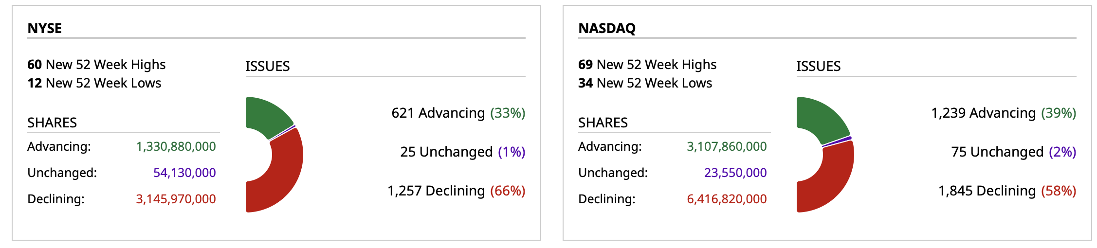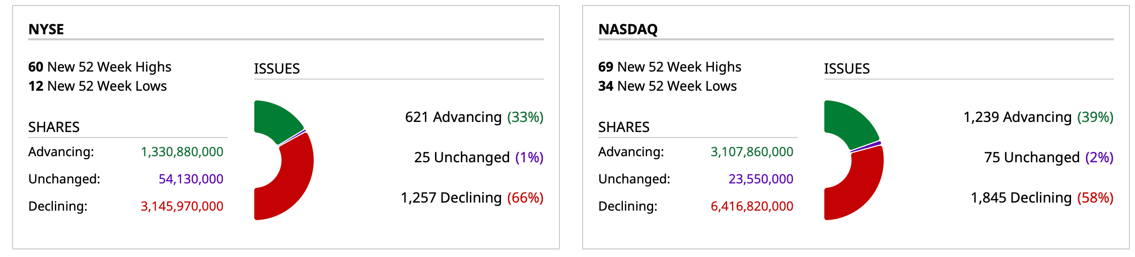 - NYSE volume 6% below its one-month average;