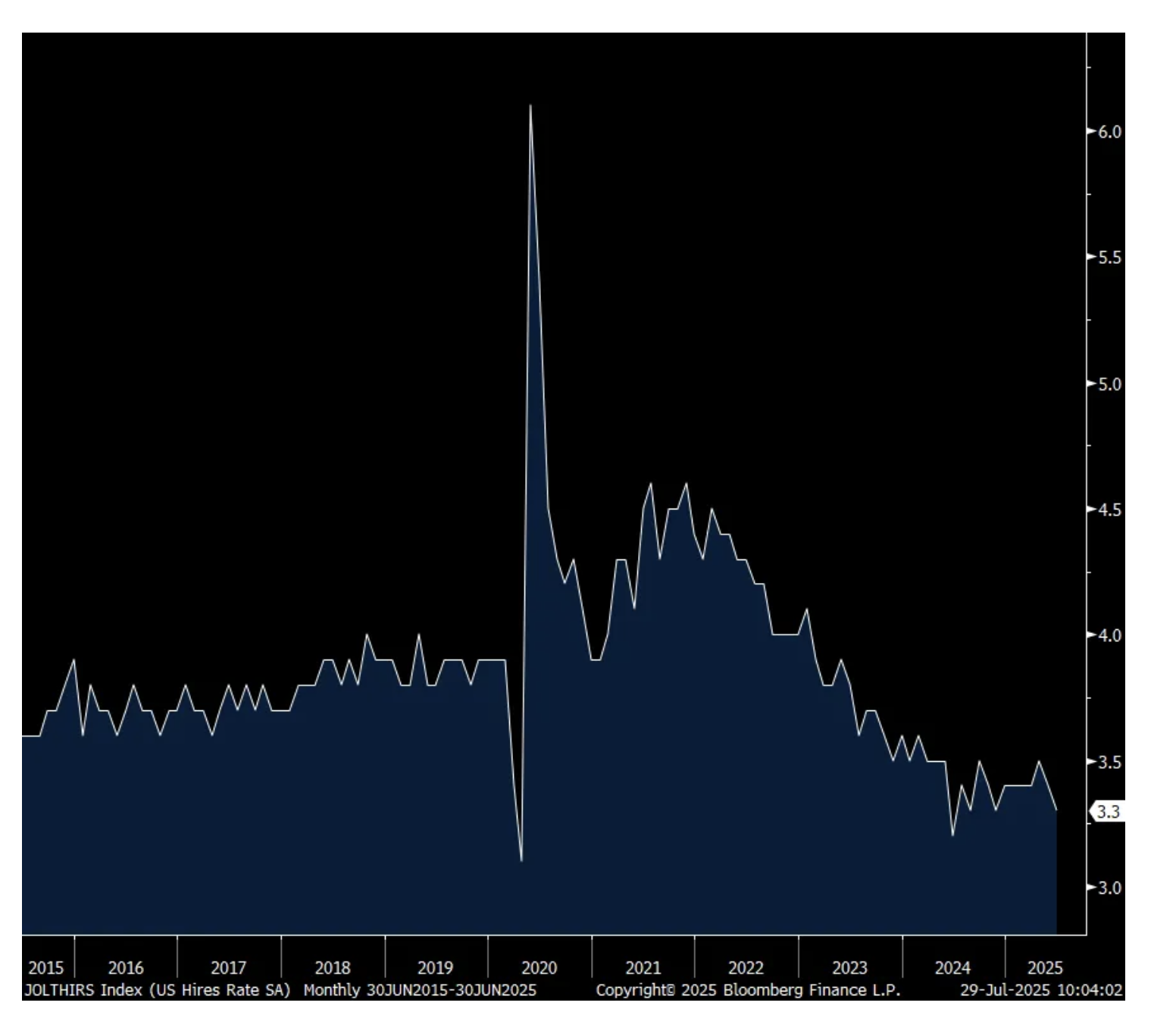 Job openings in June totaled 7.437mm, down by 275k m/o/m and just below the estimate of 7.5mm. With the 2nd straight month of declines in hiring’s, the hiring rate fell to 3.3% which matches the lowest since June 2024 and is just one tenth from matching the least since 2013 not including Covid. The quit rate was at 2% for a 3rd straight month.