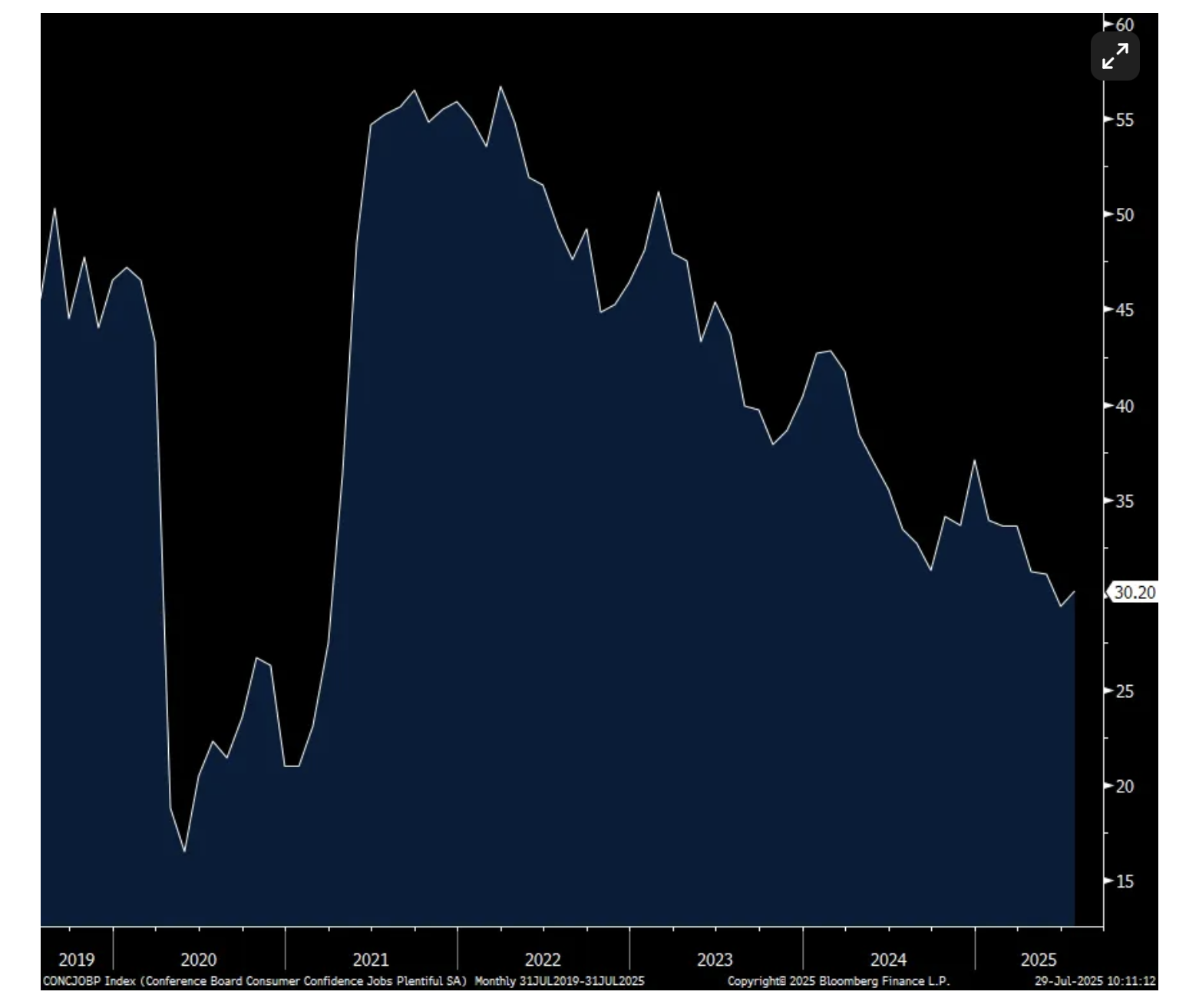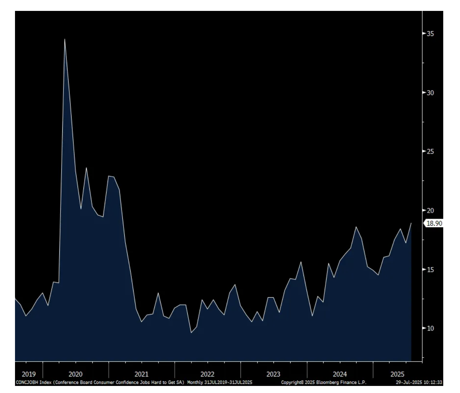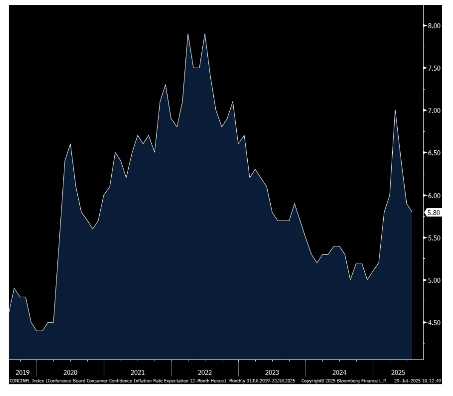 The Conference Board said “Consumers’ write-in response showed that tariffs remained top of mind and were mostly associated with concerns that they would lead to higher prices. In addition, references to high prices and inflation rose in July, even though consumers’ average 12 month inflation expectations eased slightly.”