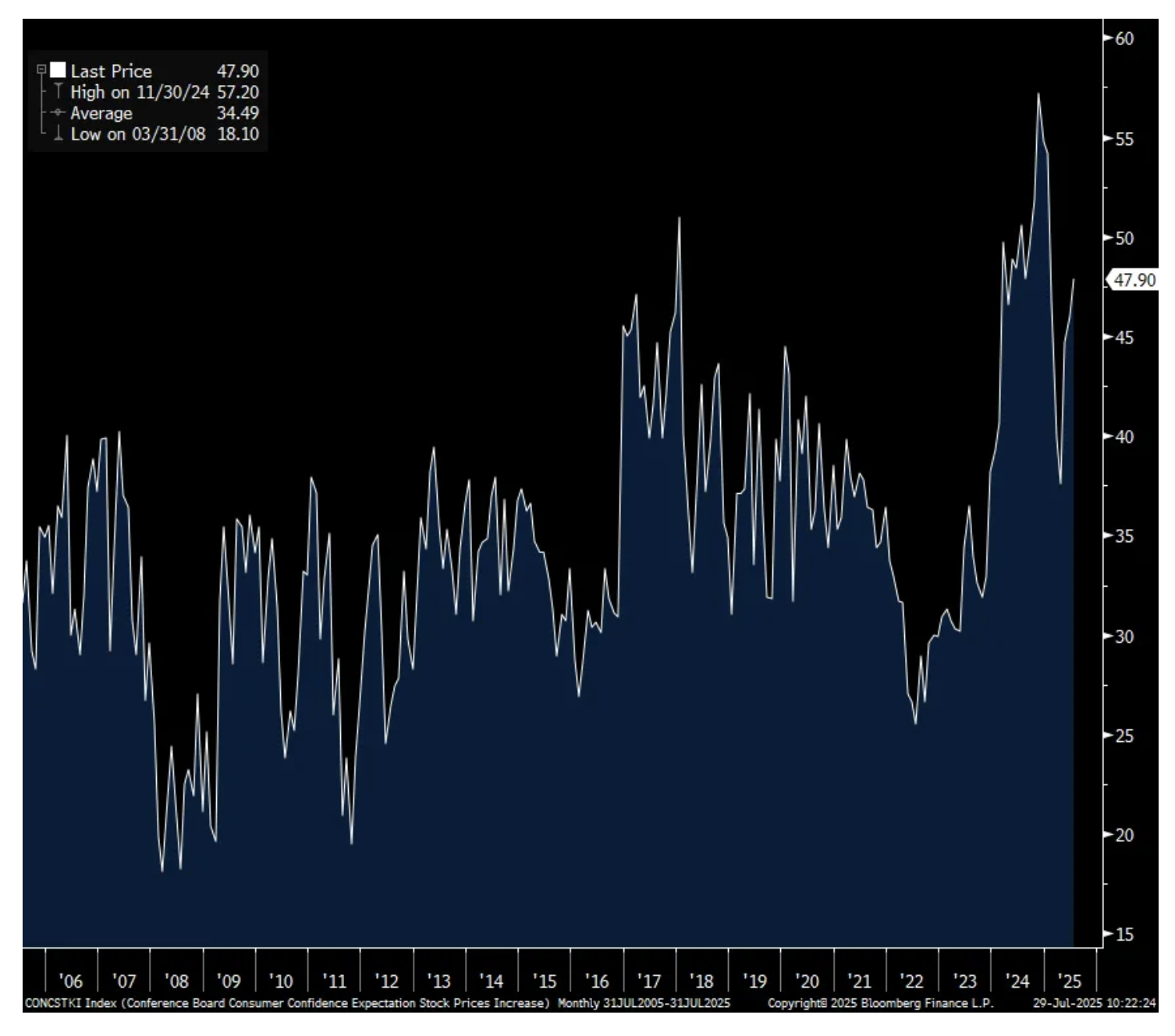 “The share of consumers expecting a recession over the next 12 months declined slightly in July but was still above the levels seen in 2024” said the press release. Also, those expecting higher stock prices in the coming 12 months rose to 47.9% from 46% as it recovers off the April bottom when it fell to 37.6%. It did get as high as 57.2% in November 2024.