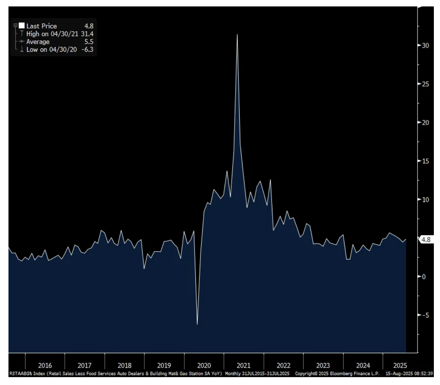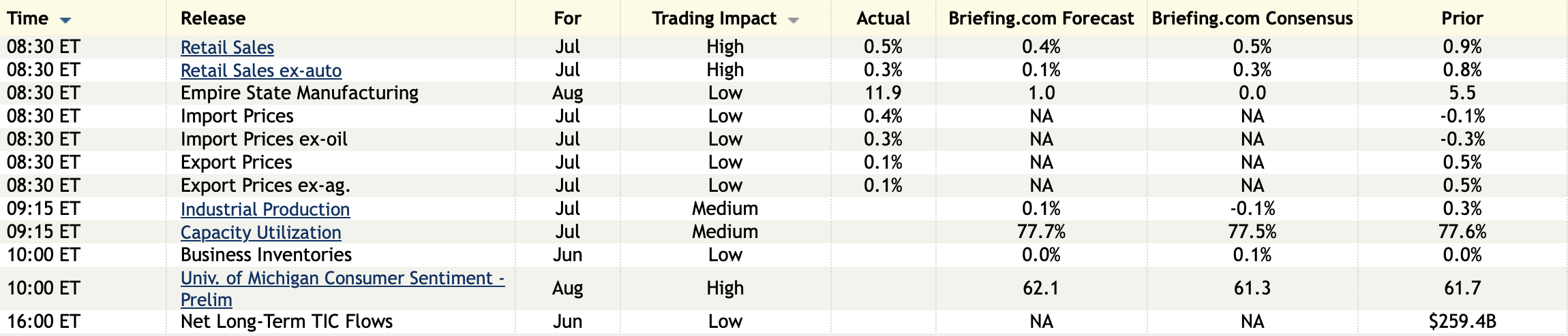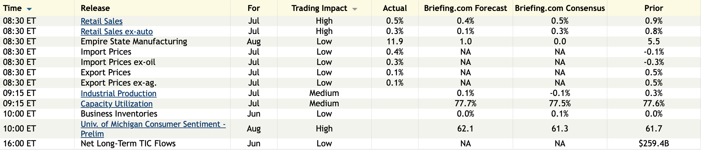 2) Core retail sales in July rose .5% m/o/m, one tenth more than expected and June was revised up by 3 tenths to an .8% gain. Above the core, auto sales rose 1.6% m/o/m while building materials fell by 1.3%.