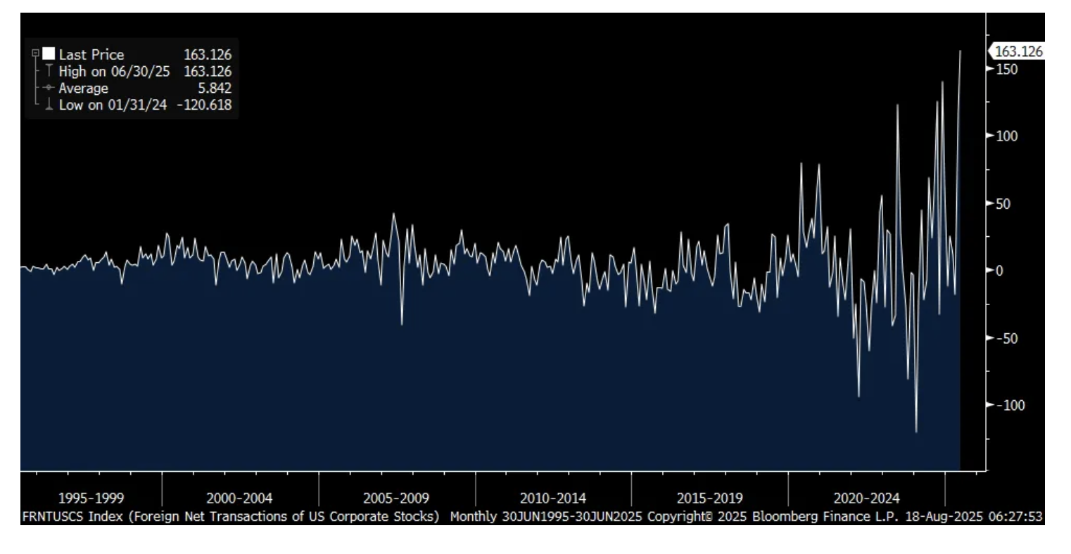 Seen Friday was the June TIC data reflecting foreign purchases of US assets and vice versa. While foreigners sold on net US Treasuries by $5b after a large rebound in May, they gobbled up US equities. In fact, with US stocks, they've never bought this much in any one month, purchasing $163b worth on net. Let's hope they are not a contrarian indicator because they bought a record amount, at the time, in February 2000 and did so again in May 2007. On the other hand, they used pullbacks in 2020 and 2022 to add.
