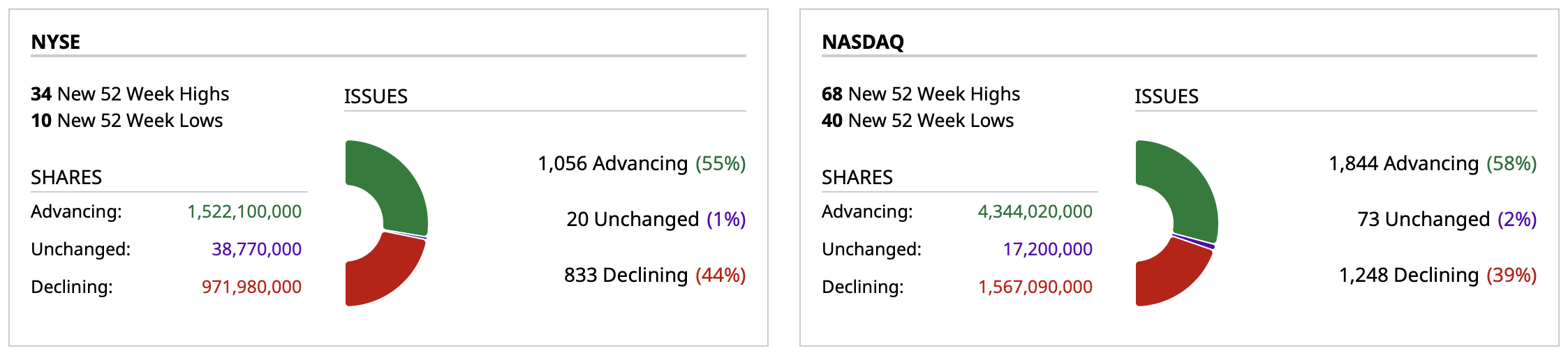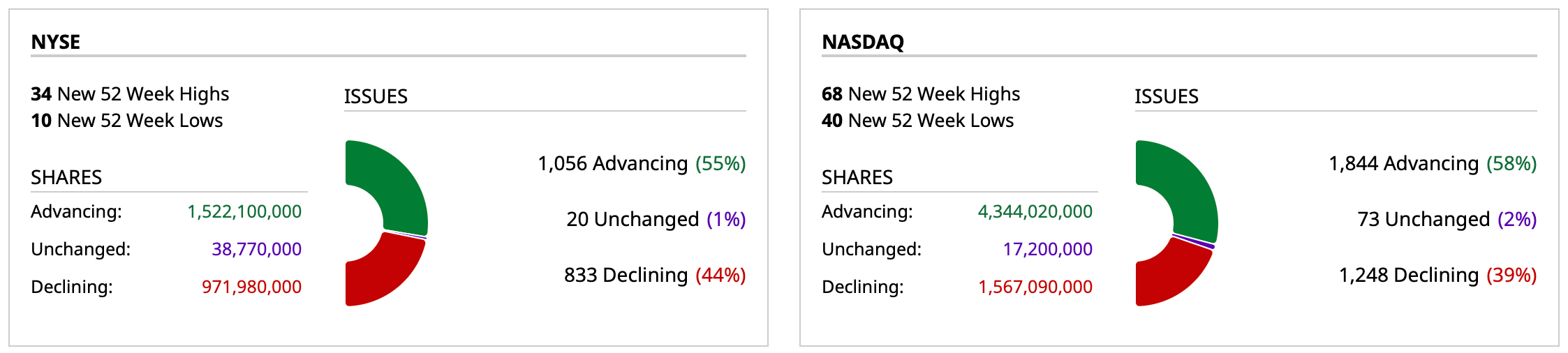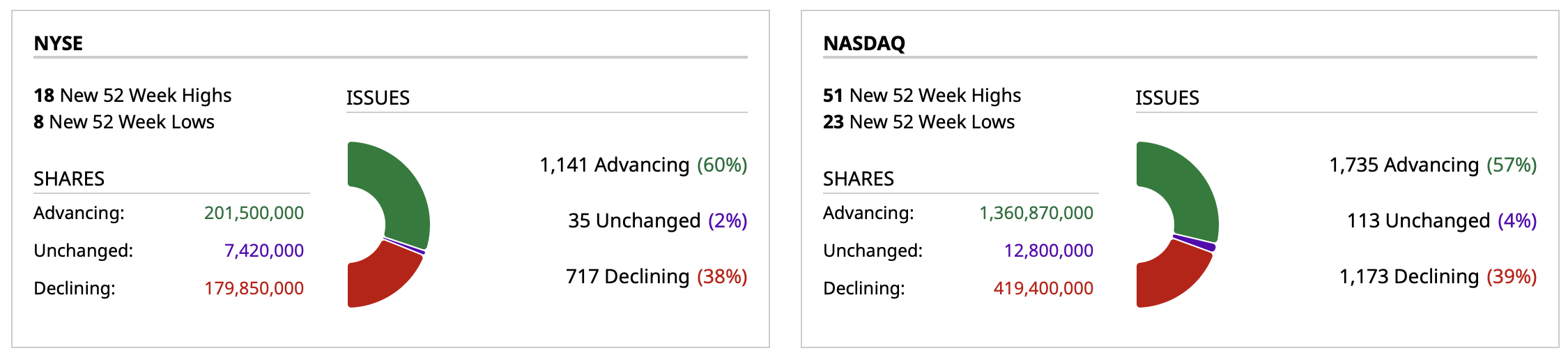 - Nasdaq volume 9% below its one-month average;
