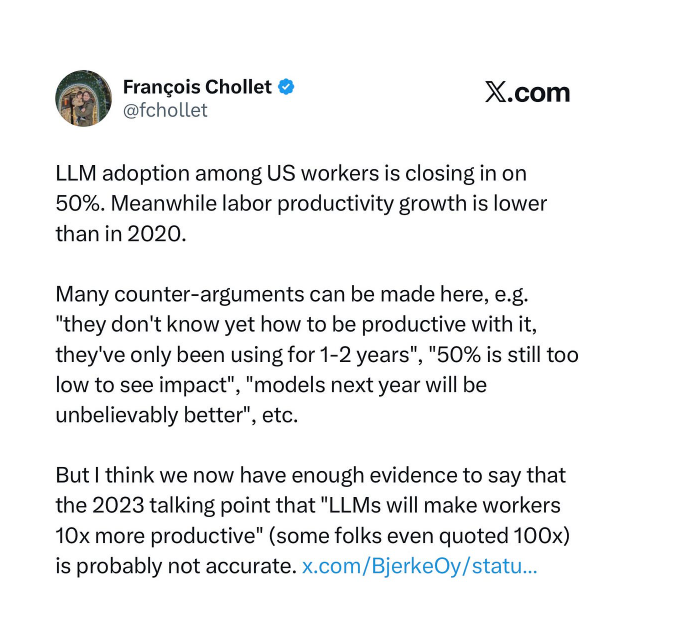 So far, AI has only been inflationary, and labor productivity growth is slower than in 2020!