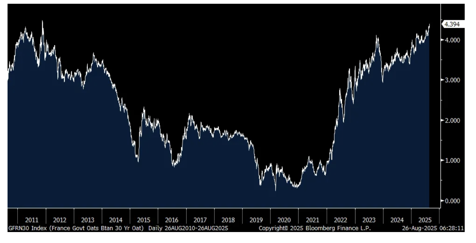 Rising long term rates is now mattering in France as Prime Minister Michel Bayrou has called for a confidence vote that could end his minority government coalition and the French CAC is trading down by 1.5% after a 1.6% decline yesterday. He did so in order to push back against the political opposition to the proposed spending cuts and tax increases that have been laid out to trim France's debts and deficits and whose high levels is what the bond market is most worried about. The French 30 yr yield is flattish today but sitting at a 14 yr high. In sympathy, the UK 30 yr yield is at a 17 yr high, the 30 yr JGB yield closed flat but at its 26 yr high and the US 30 yr Treasury yield is at a one month high at 4.93-.94% and is just 18 bps from an 18 yr high.