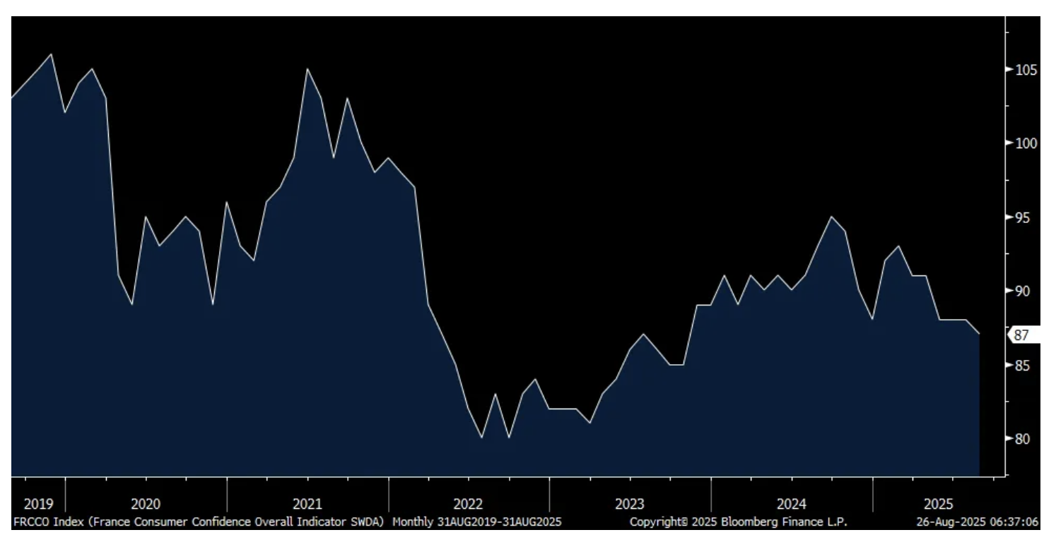French consumer confidence for August also came out and it fell 1 pt m/o/m to 87, two points below expectations and is at the lowest level since October 2023.