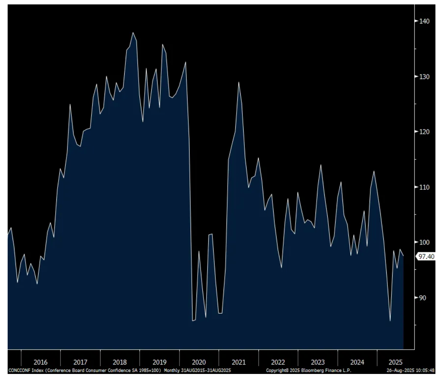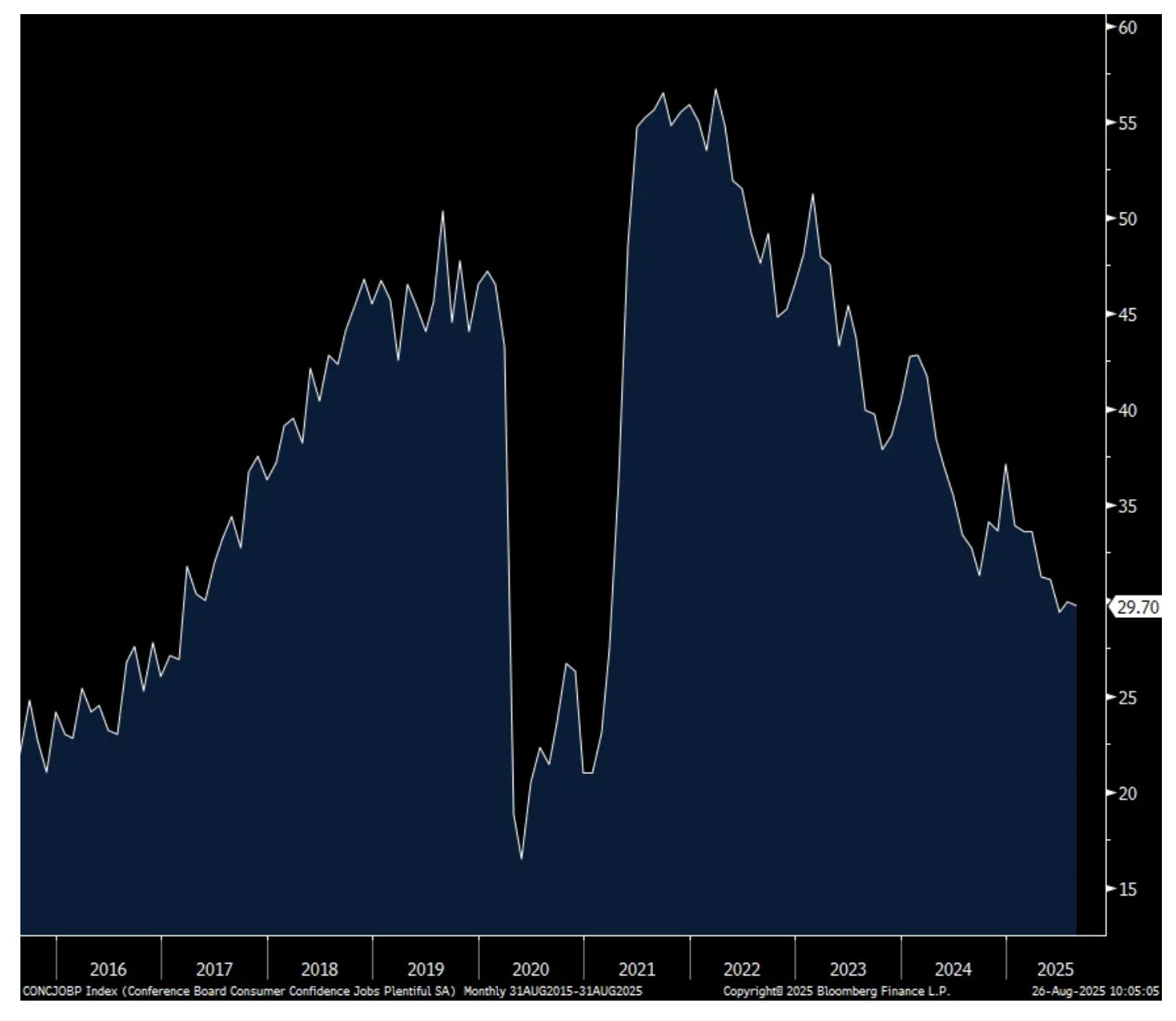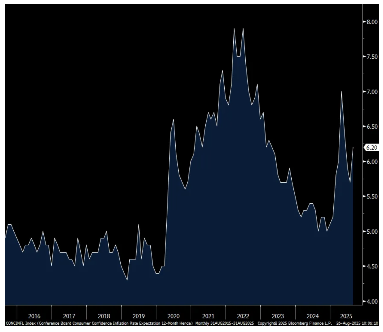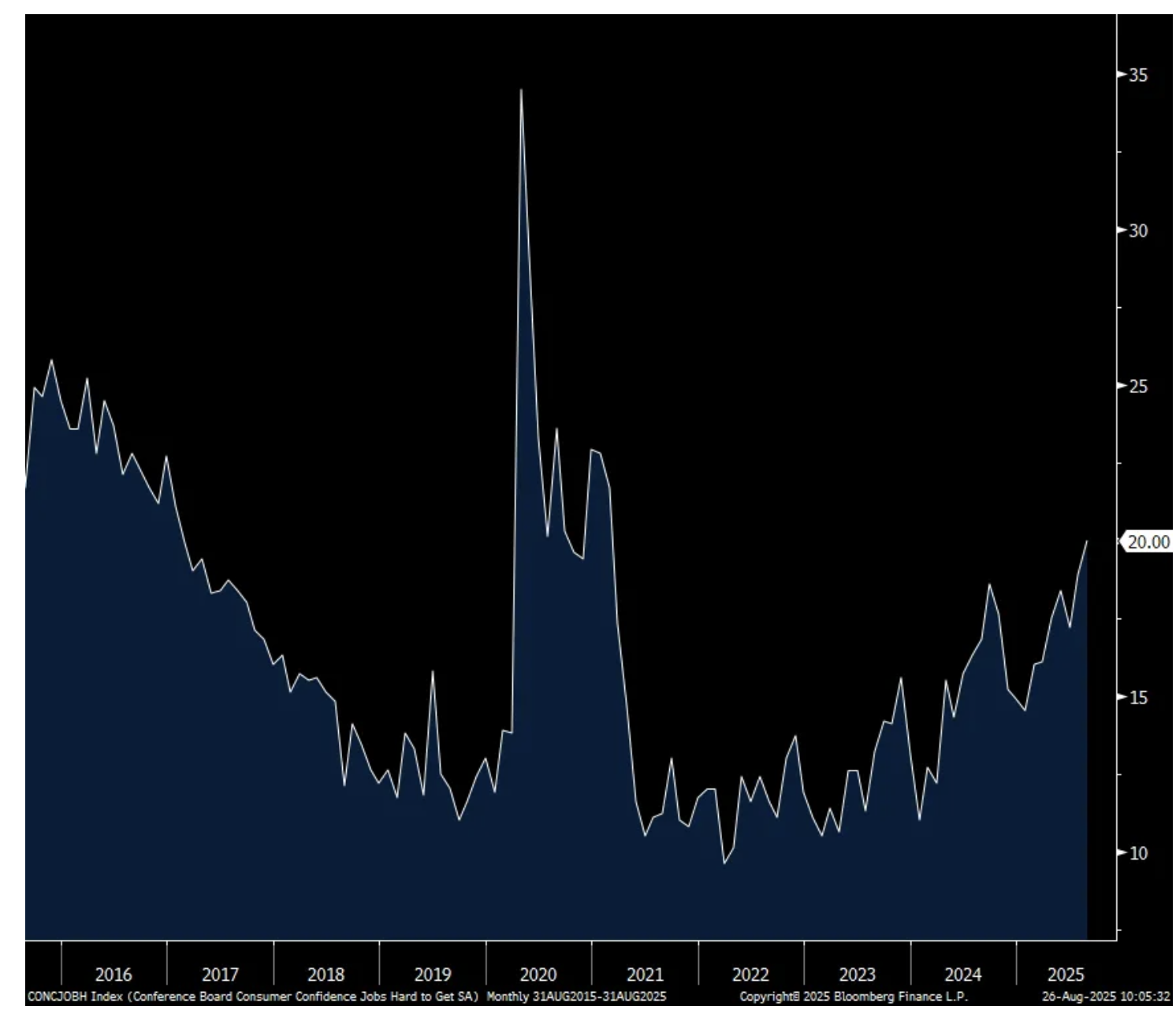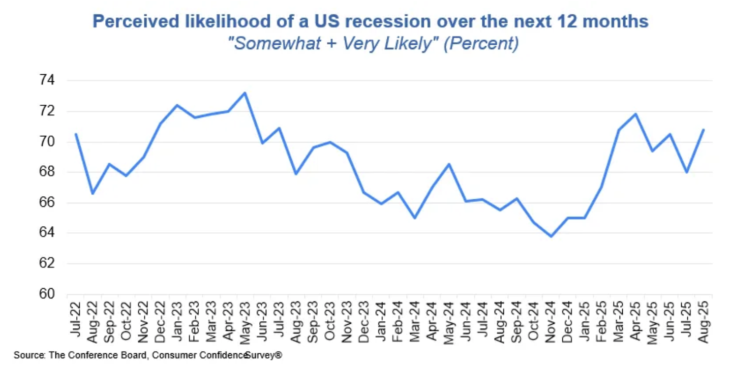 On the rise in inflation expectations, the Conference Board said “Consumers’ write-in responses showed that references to tariffs increased somewhat and continued to be associated with concerns about higher prices. Meanwhile, references to high prices and inflation, including food and groceries, rose again in August.”