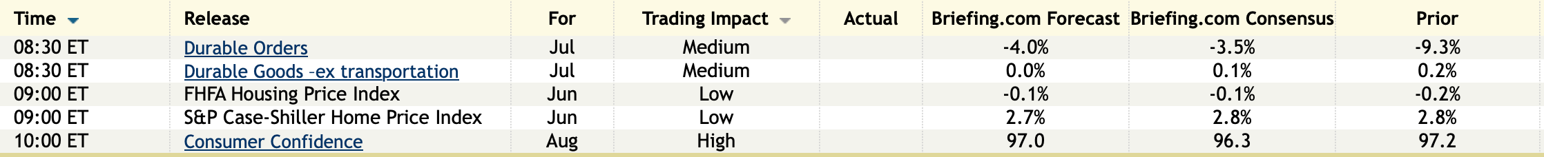 The August consumer confidence index from the Conference Board fell to 97.4 from a revised 98.7 in July (from 97.2 initially) but that was just above the estimate of 96.5. For perspective, this figure has averaged 96.8 year to date. The Present Situation was down slightly while the Expectations component was up a bit. One year inflation expectations did lift to 6.2% from 5.7% in July and 5.9% in June.
