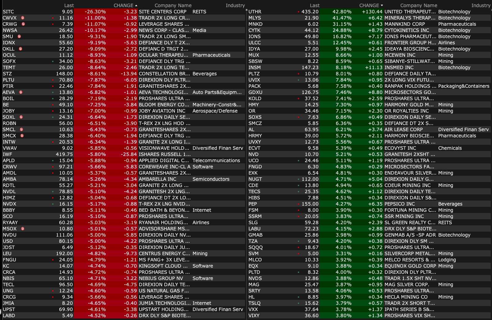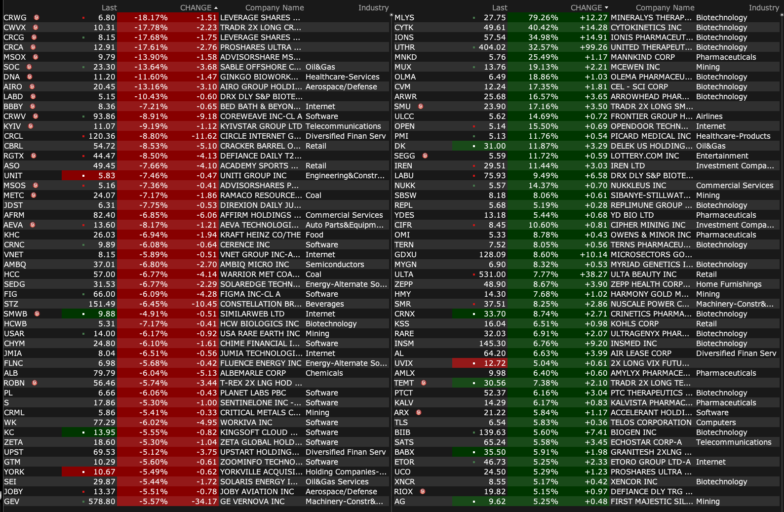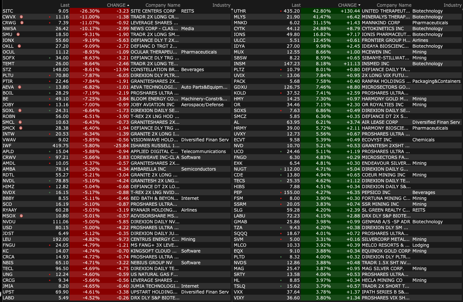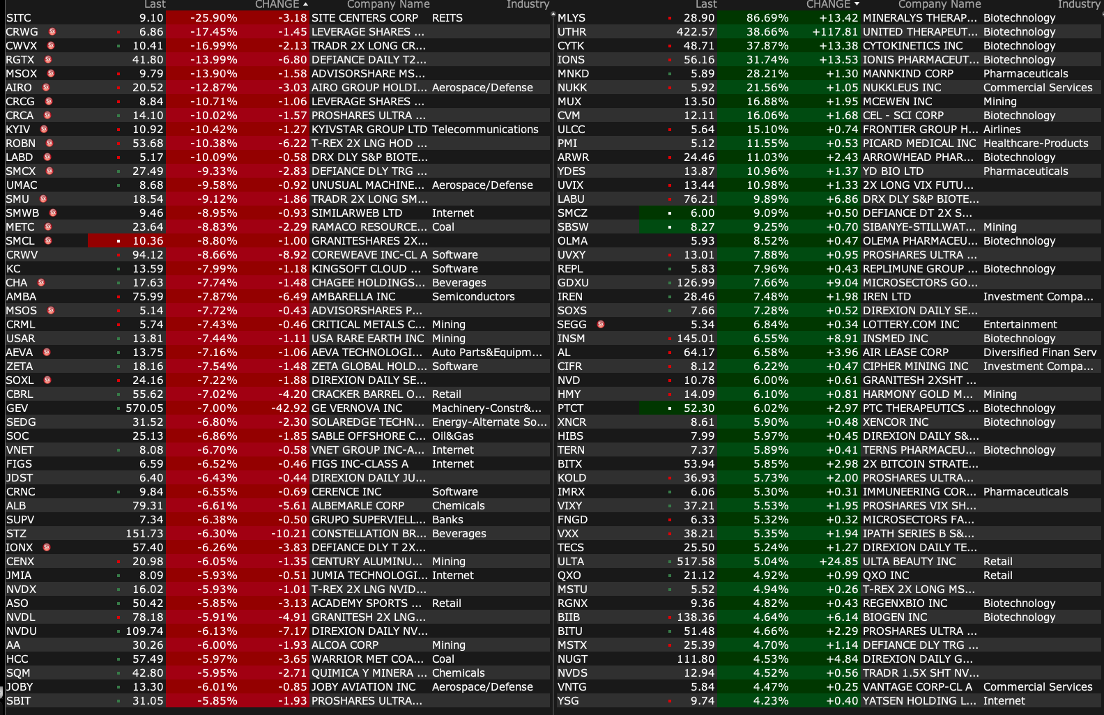 -CYTK +26% (late-stage study data shows Company’s drug more effective for heart disease symptoms than standard-of-care)