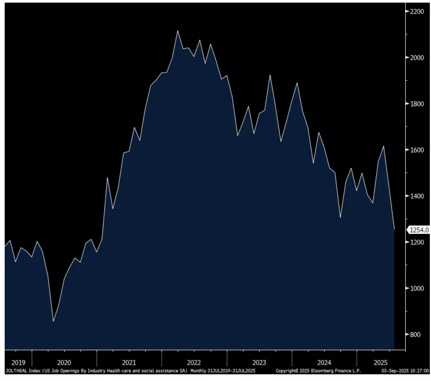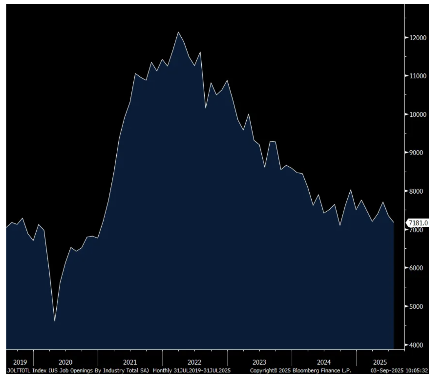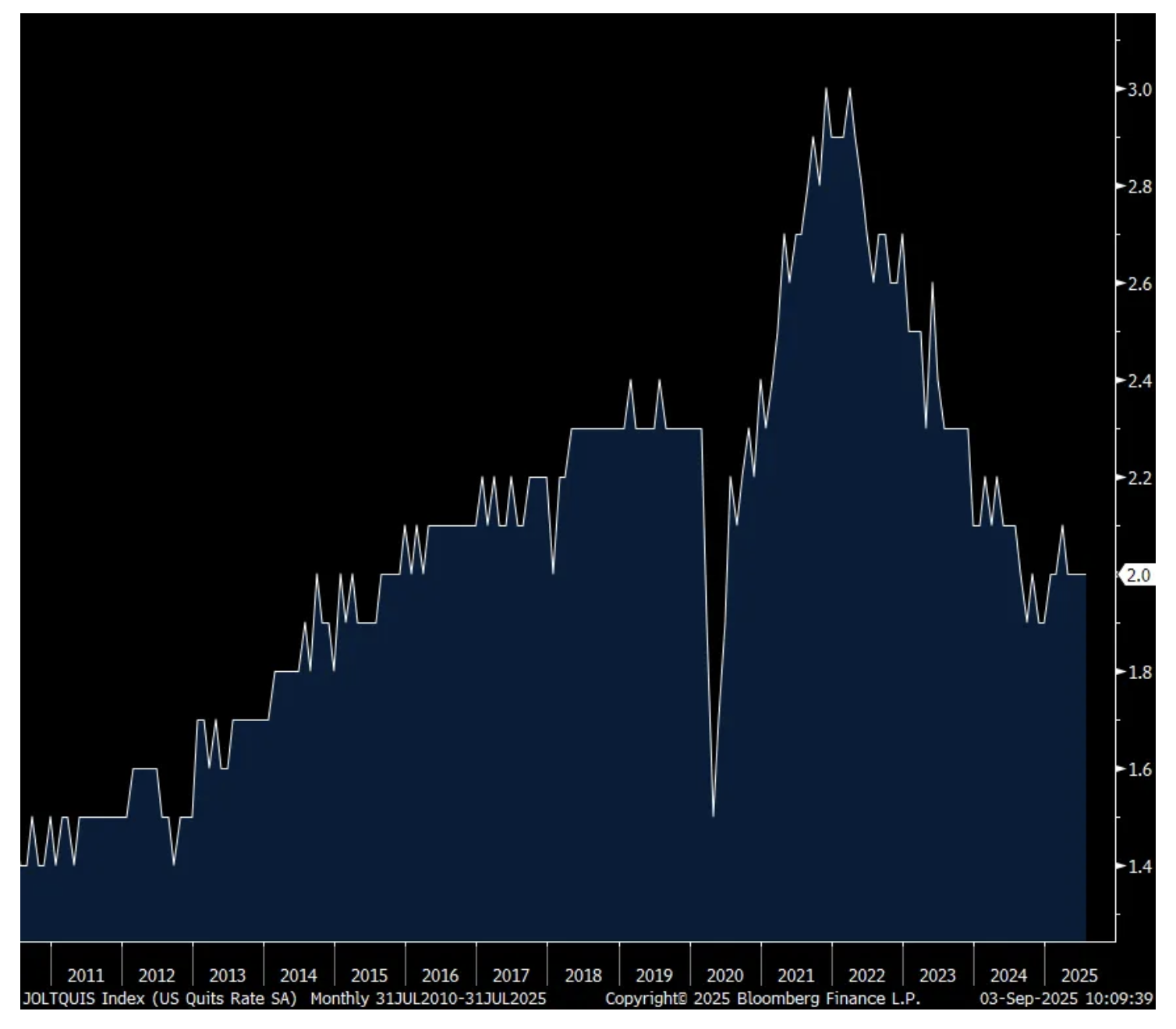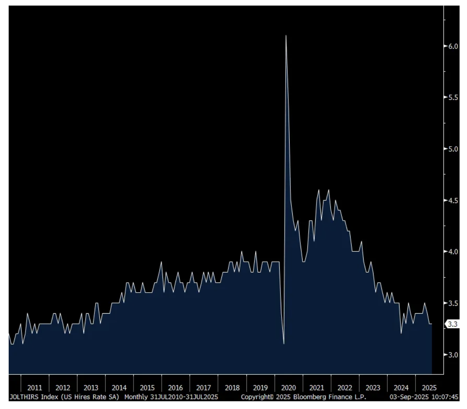 In July, there were 7.181mm job openings in the US economy (with double/triple counting taking place) and that is a reduction from the 7.437mm seen in June and 200k below expectations. That’s also the least since September 2024. The hiring rate was 3.3%, at that level for a 5th straight month and that is just one tenth above the lowest level since 2013 not including Covid. The quit rate was 2% for a 4th straight month. That’s one tenth above the lowest since 2015, also not including Covid.