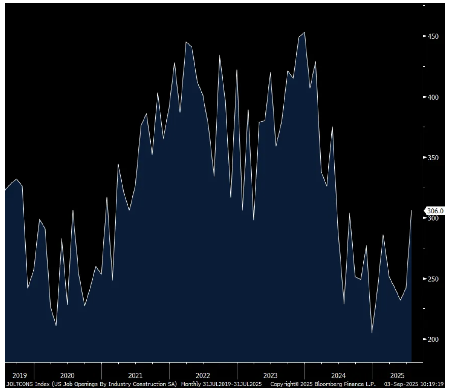 Likely due to the data center buildout, the demand for construction jobs rose to 306k from 242k and that is the most since May 2024. Job openings for ‘information’ were up too, the highest since November 2022.