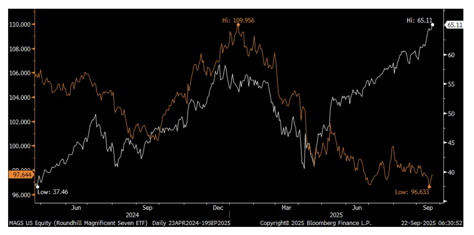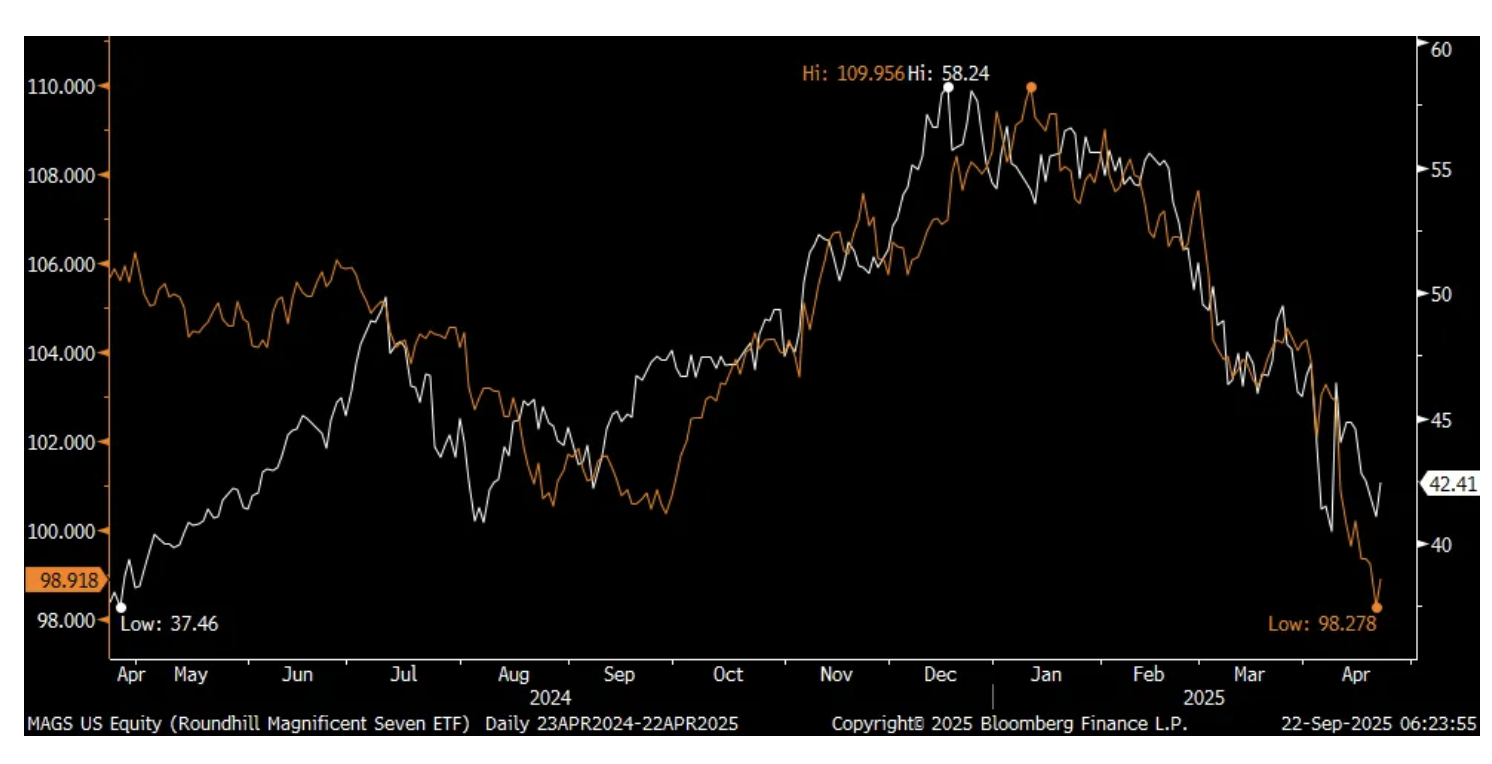 DXY in orange, MAGS etf in white (April 2024-April 2025)