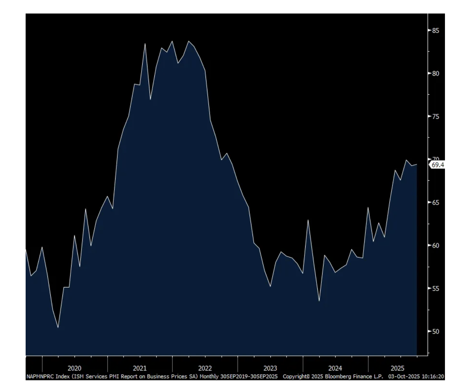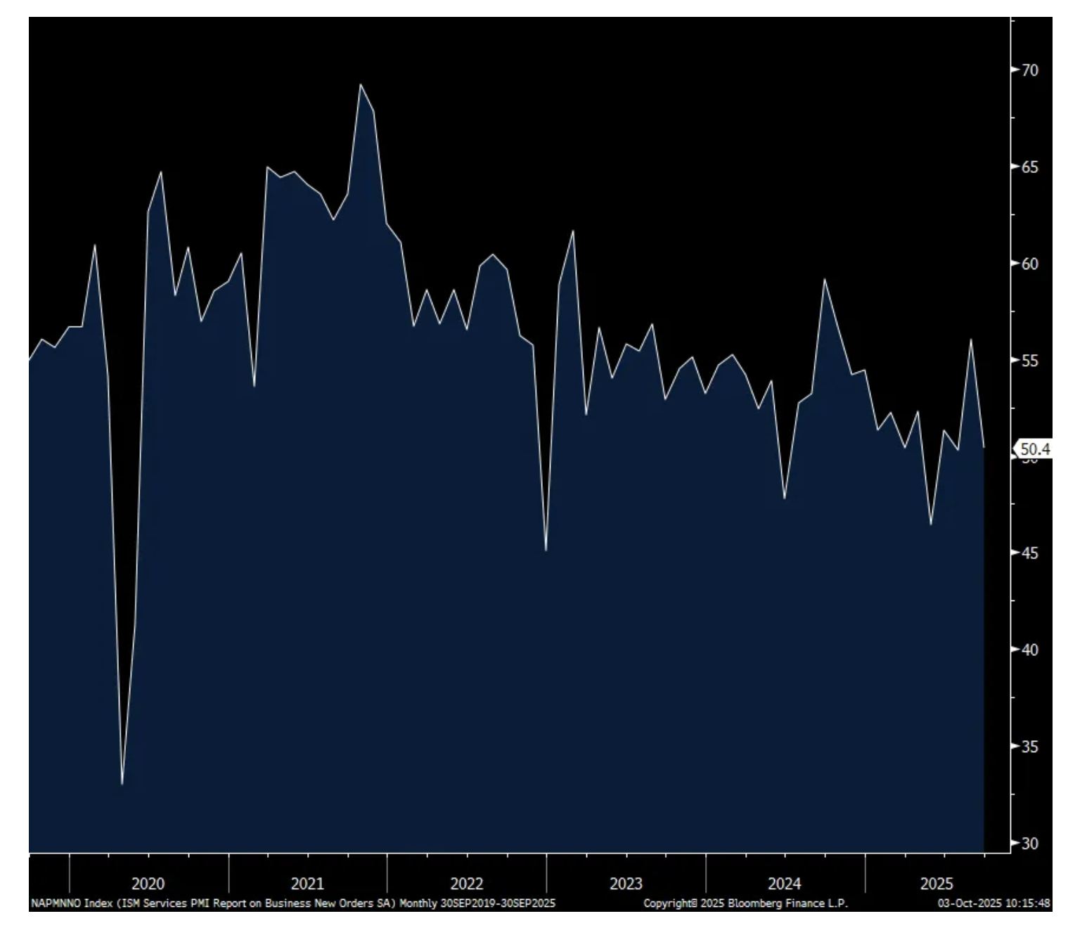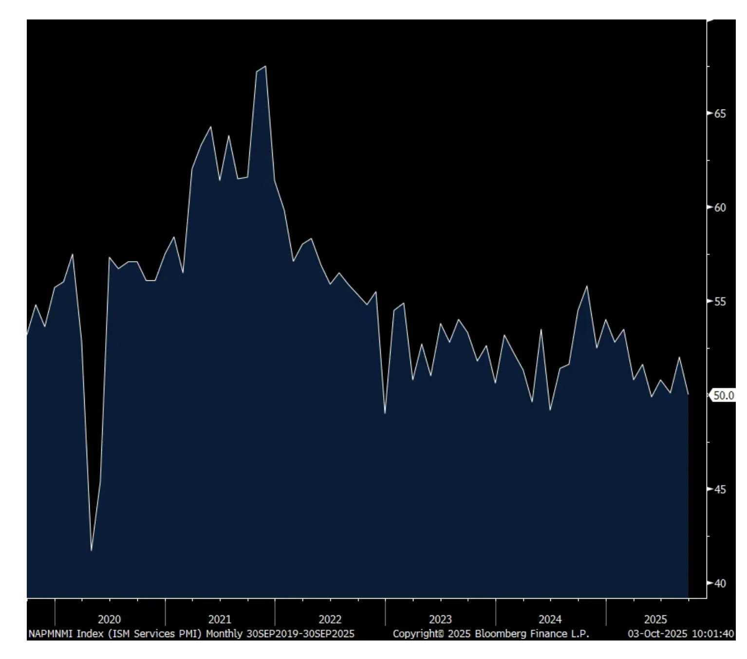 The September ISM services index fell to exactly 50 from 52 in August and compares with the estimate of 51.7. That’s also the 2nd lowest print since June 2024. The Business Activity component fell 5.1 pts to 49.9.