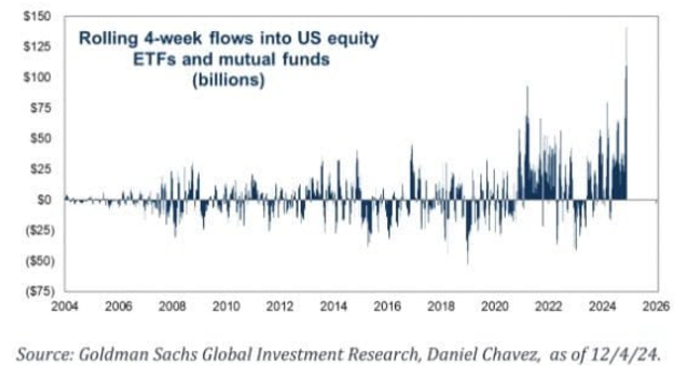 Vanguard’s numbers were rather shocking: workers in their late 30s had 88% of their 401(k)s concentrated in stocks last year, while — get this — 401(k) investors in their early 60s had boosted their allocations to stocks of an unheard-of 60%. This is about double the exposure these folks should have in their portfolio. In target-date funds, which move money from stocks to bonds as retirement approaches, the average equity allocation (for workers just beginning their careers) was 92% (at the end of 2024). This speaks to an equity culture in which everybody is loaded up on risk all at the same time. Talk about throwing caution to the wind.