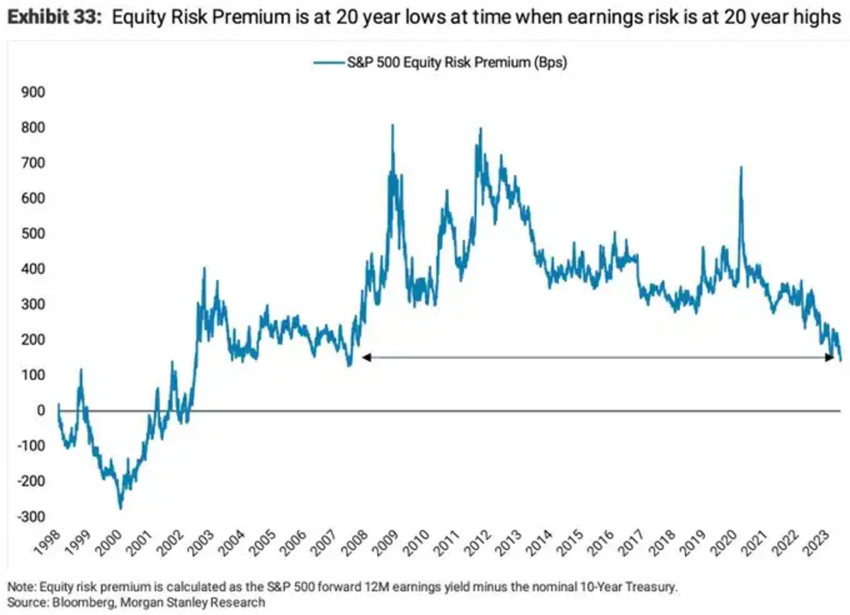 In part, those inflows, have contributed to a near unprecedented narrowing in the equity risk premium (to 20-year lows) while the risk to earnings growth are at 20-year highs: