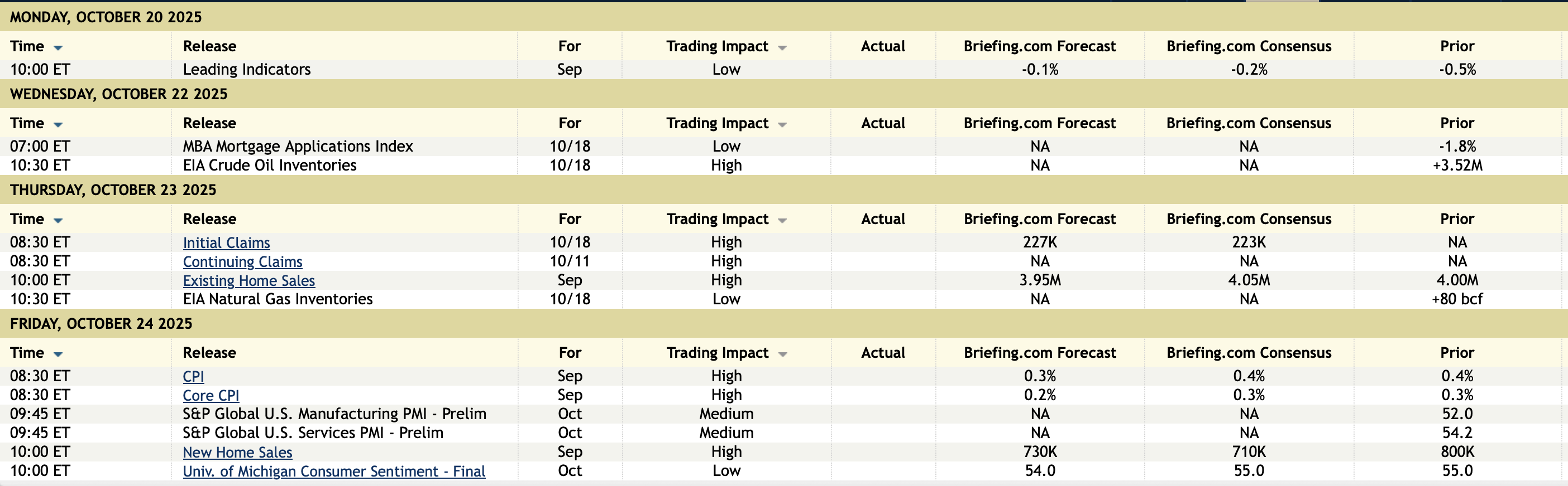 Economic Calendar originally scheduled for the Week: