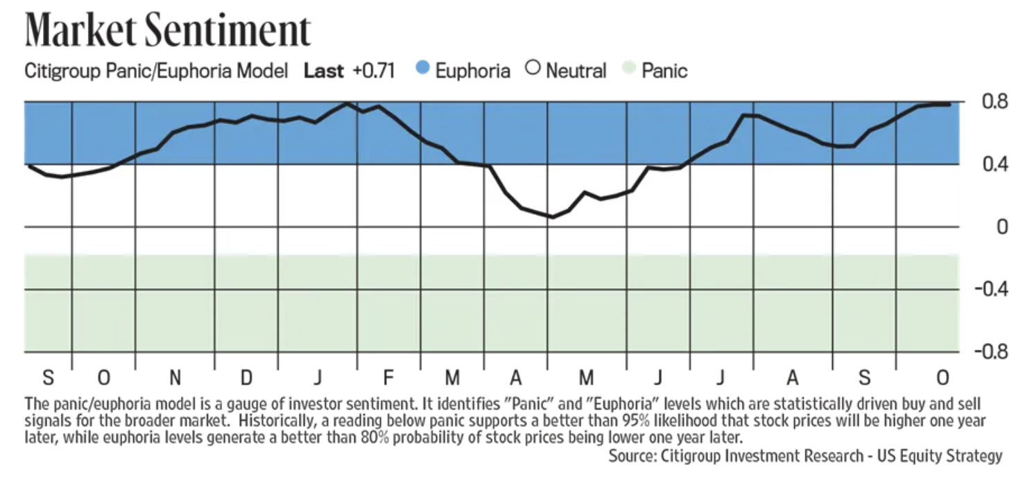 I often cite the Citi Panic/Euphoria index as part of my stock market sentiment mosaic and view it each Saturday within Barron’s. This past weekend saw its read at .71 which is well above the Euphoria threshold of .41 and is almost as Euphoric as it got in 2021. Take heed as it says “Historically, a reading below panic supports a better than 95% likelihood that stock prices will be higher one year later, while euphoria levels generate a better than 80% probability of stock prices being lower one year later.”