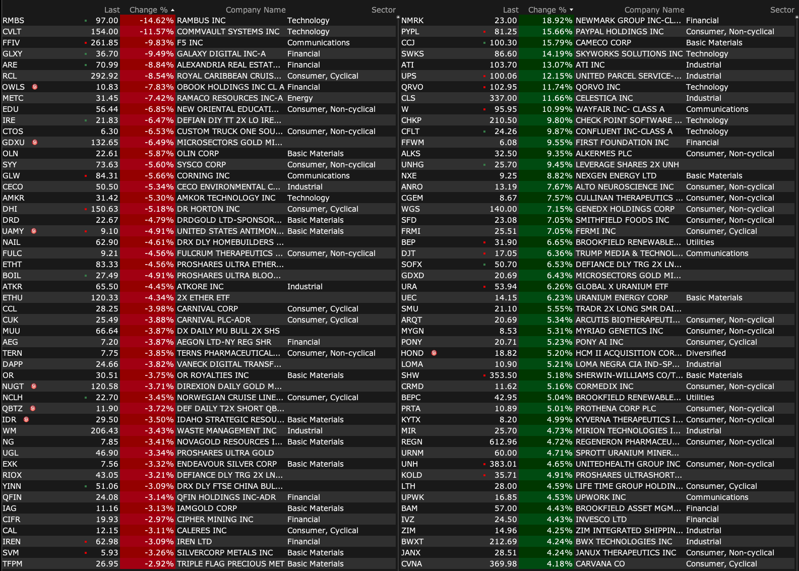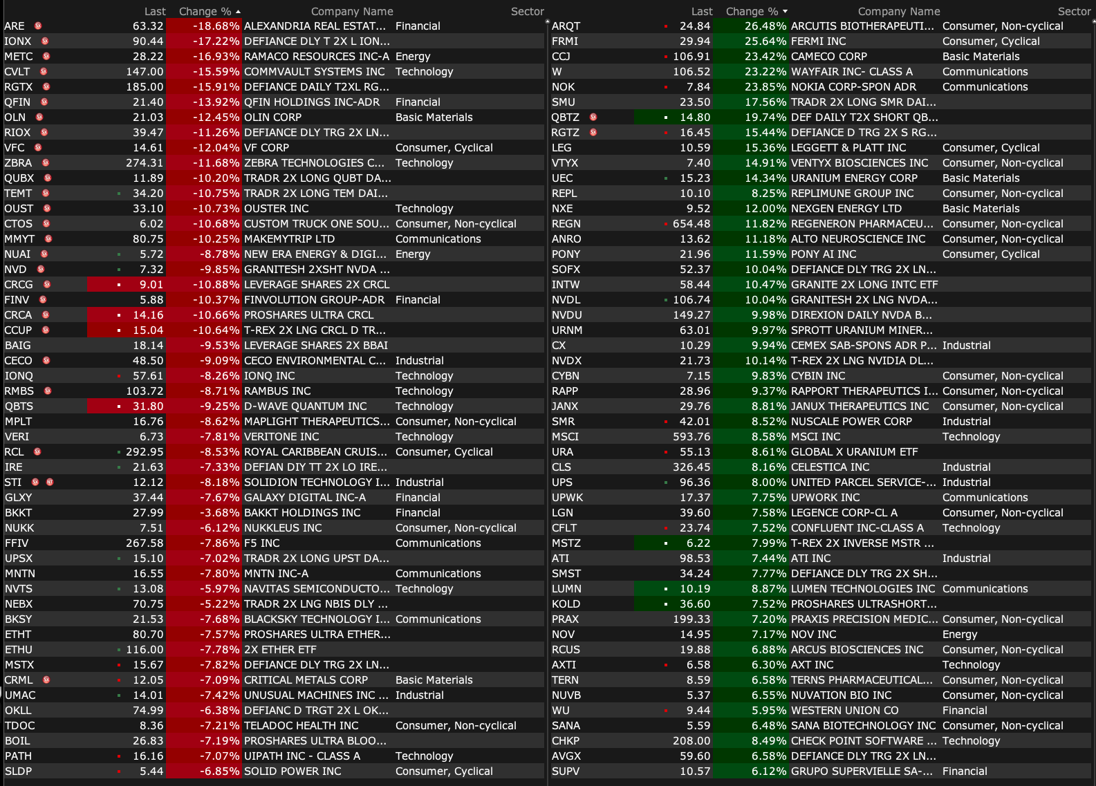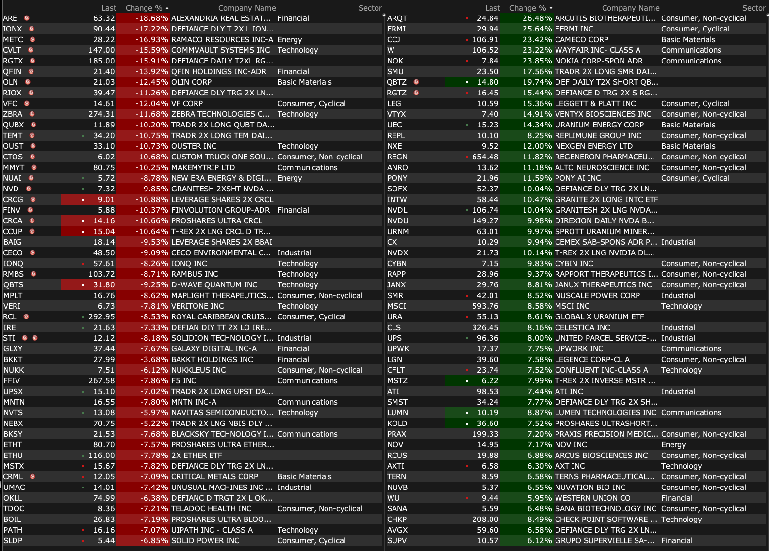 -WULF +7.8% (reports prelim Q3 revenue; TeraWulf and Fluidstack form 25-year HPC joint venture for 168 MW critical IT load at Abernathy, TX, expected H2 2026)