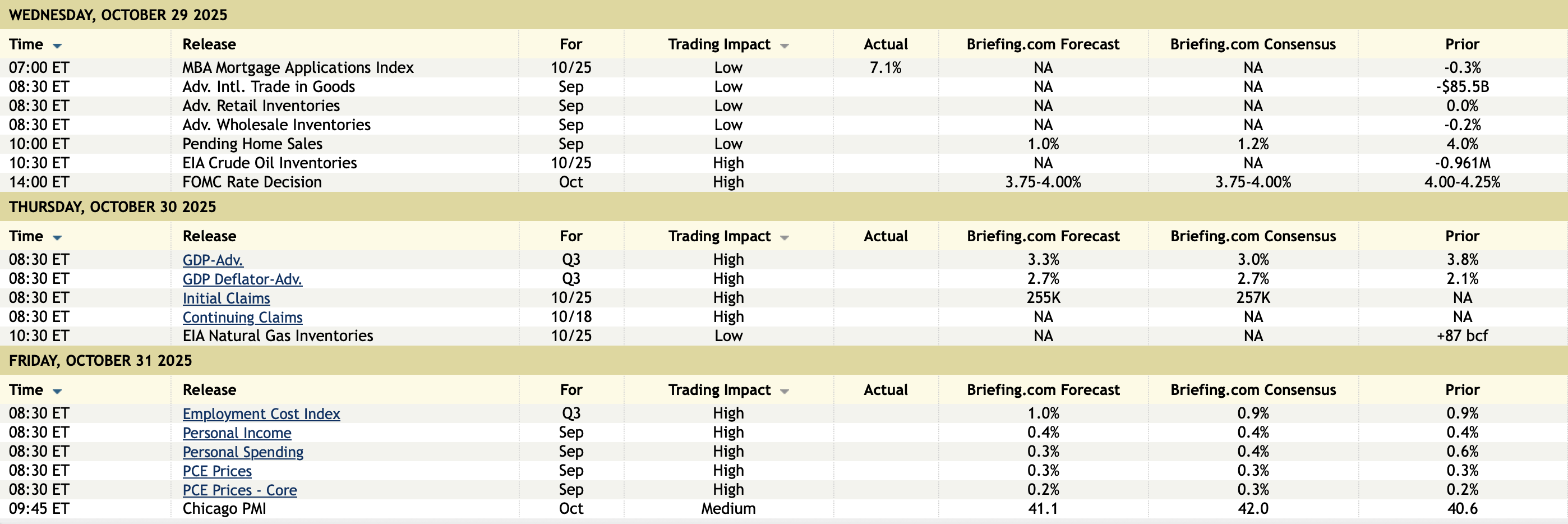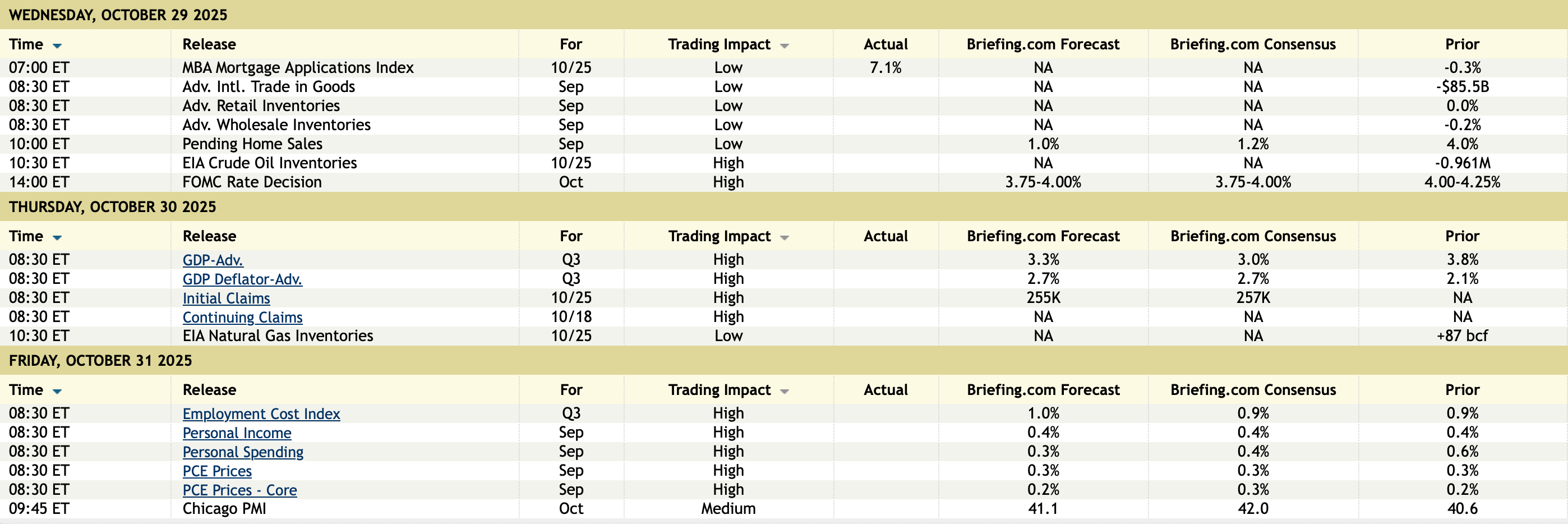 The Fed did the expected and trimmed the funds rate again by -25 basis points to a 3.75%-4.0% band and announced an end to QT as of December 1st. There were two dissents, which is very rare — and even rarer, Kansas City Fed President Schmid voted for no move, and Governor Miran predictably pushed for a -50-basis-point cut. Investors may well be disappointed, even with few surprises, by the lack of any support for the market view of five more rate cuts ahead or even in December, which had been nearly fully priced in; and also by the fact that there was a dissent for no rate relief (unlike Schmid’s dissent, Miran’s was totally expected). We will have to await what Powell says at the presser. In the immediate aftermath of the statement, bond yields have ticked up a little more, and the stock market rally has stalled out. Based on the Bank of Canada this morning, benchmarked against what is priced in, the risk is that the Fed Chairman fails to deliver a dovish policy message.