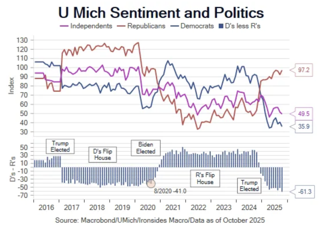 As a follow up to my chart yesterday of the consumer confidence of Independents, my friend Barry Knapp of Ironsides Macro sent me this great chart of the political breakdown of consumer confidence over different administrations and following midterm elections.