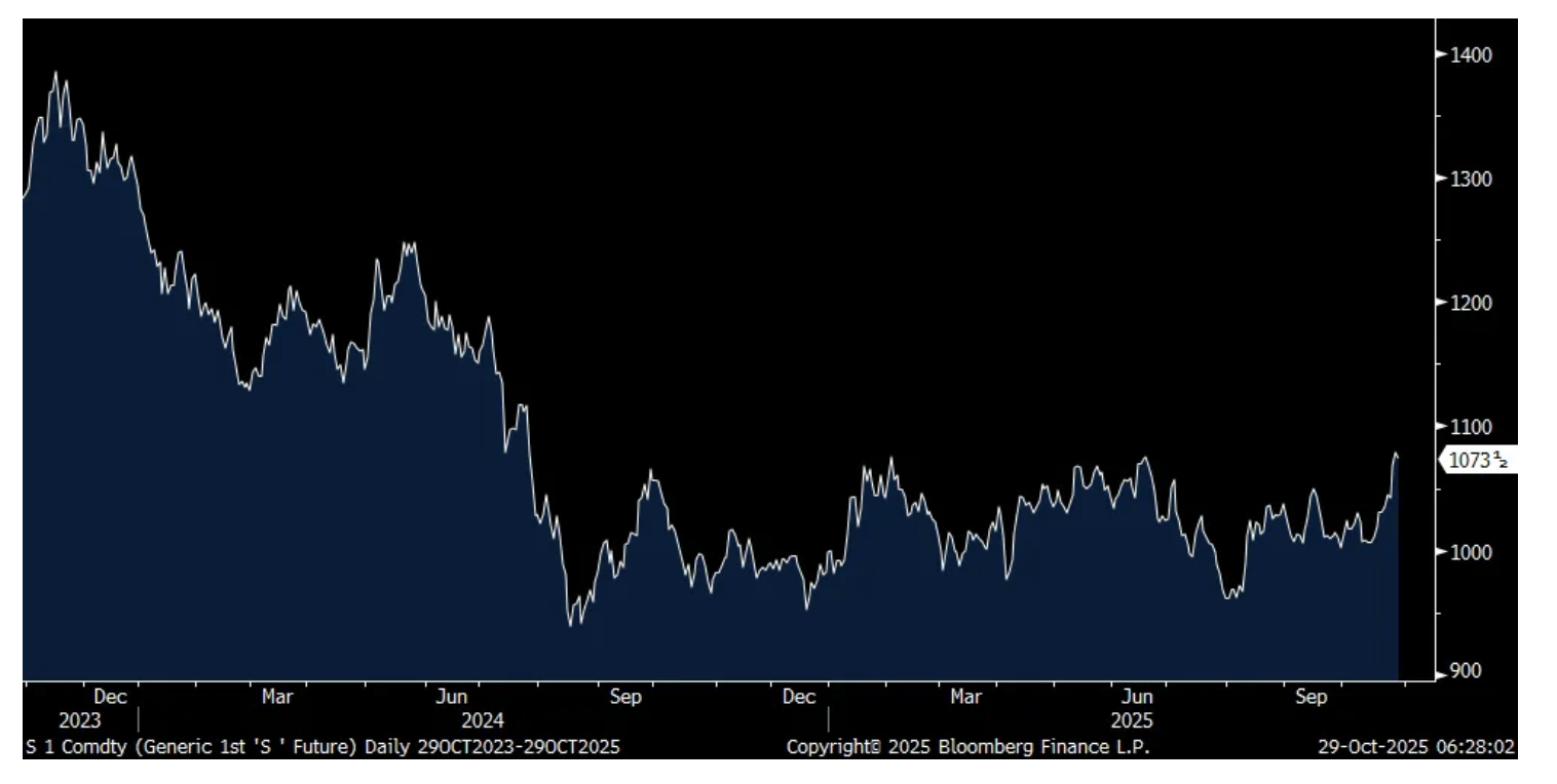 Ahead of the Trump/Xi meeting tomorrow, soybeans closed at the highest level since July 2024 yesterday, though down a touch today. China did buy a few shipments of US soybeans this week for the first time this harvest and ahead of the meeting and are we going to give them Nvidia Blackwell chips in return?