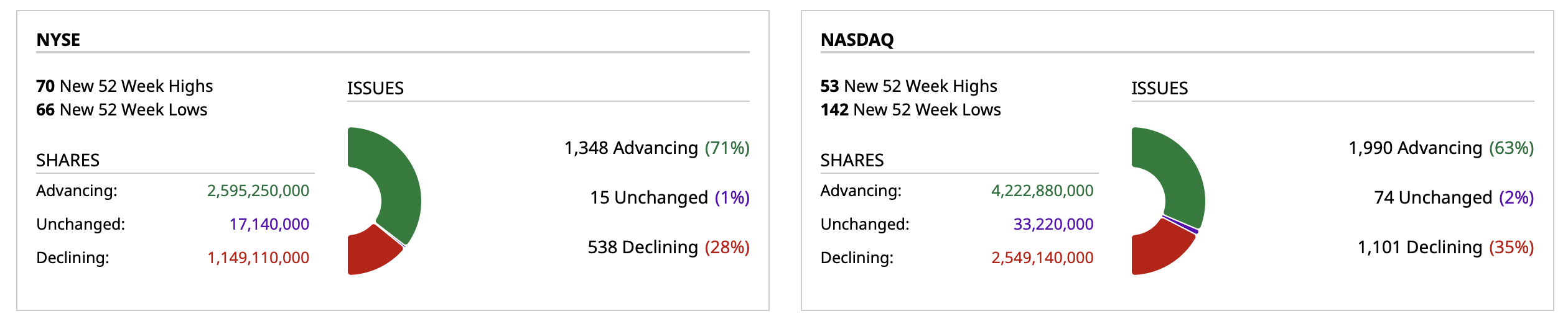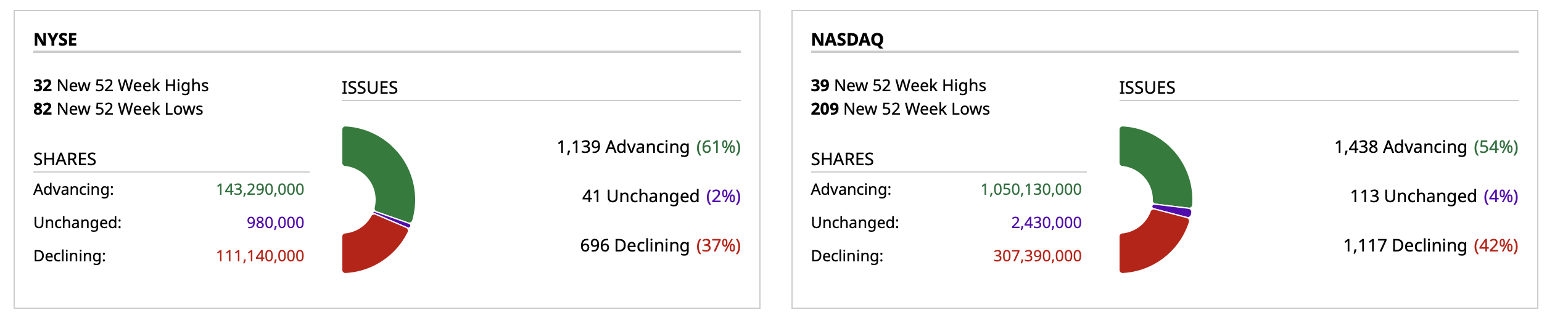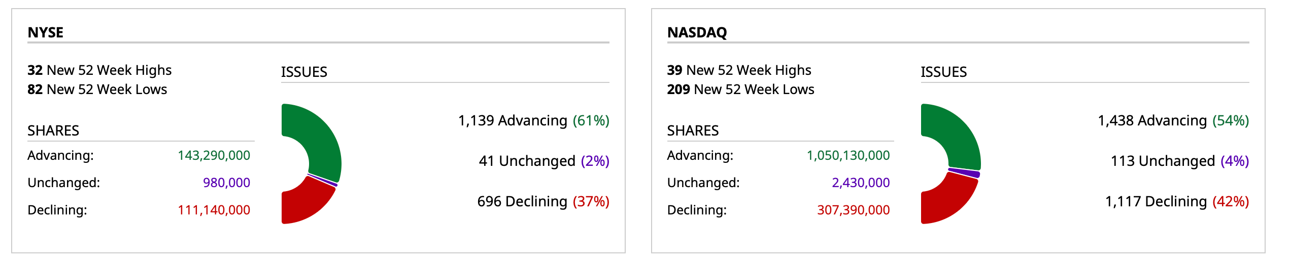 - Nasdaq volume 6% below its one-month average;