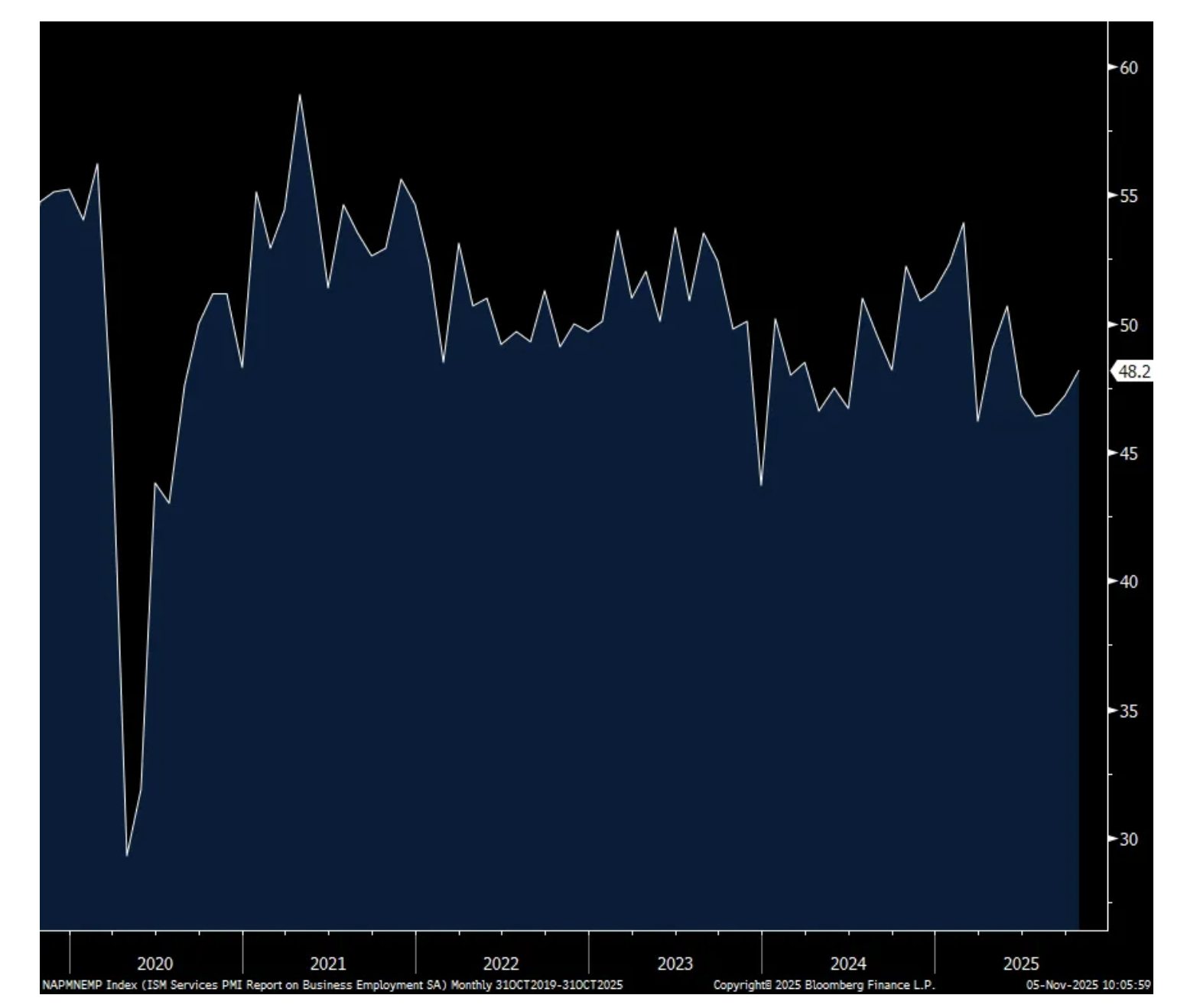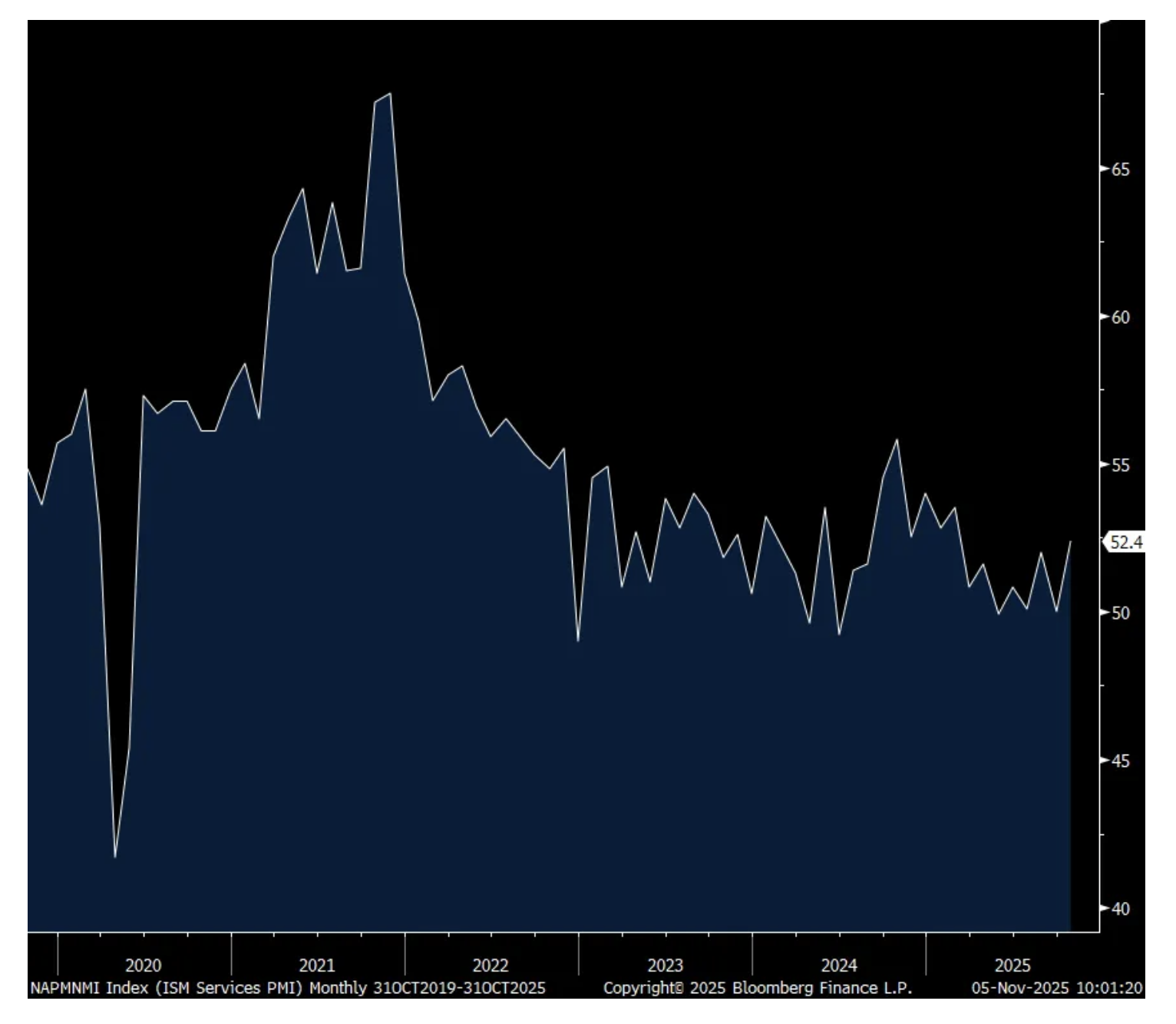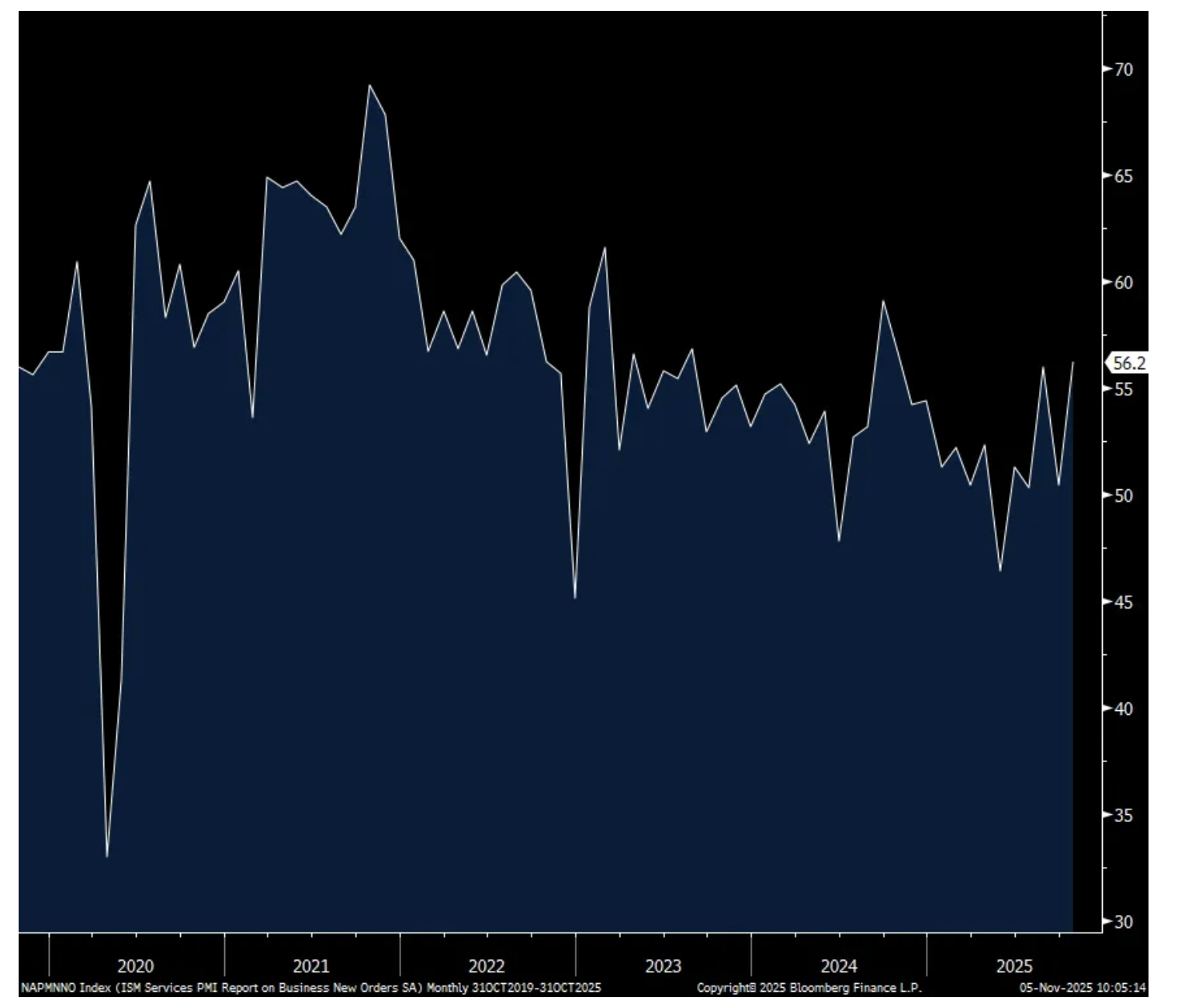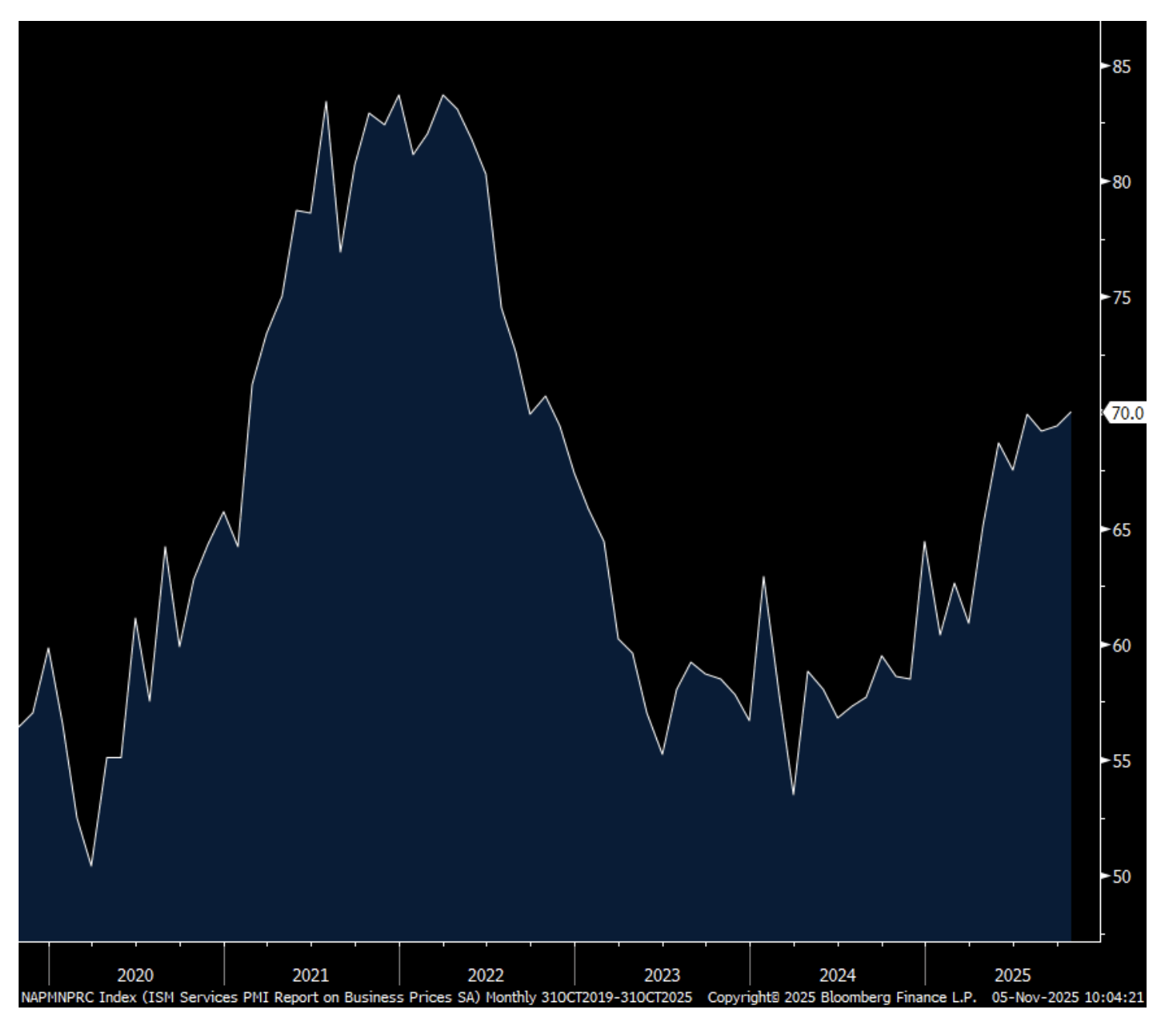 Employment rose 1 pt but stayed below 50 at 48.2 with just 4 industries adding workers. The ISM said, “There was no indication of widespread layoffs or reductions in force, but the federal government shutdown was mentioned several times as impacting business activity and generating concerns for future layoffs.” Supplier deliveries fell 1.8 pts but remained above 50 at 50.8. Prices paid touched 70, up .6 pts m/o/m and that is the highest since October 2022 with 16 of 18 industries paying higher prices. The ISM said “Respondents continued to mention the impact of tariffs on prices paid.” In other words, you don’t have to be in manufacturing to be feeling the impact of tariffs as inputs/raw materials/sourced products flow into the service sector via retail, restaurants, construction, etc…
