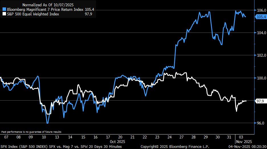 Over the last four weeks Mag 7 is +5.4% as compared to the equal-weighted S&P index being down by -2.1%: