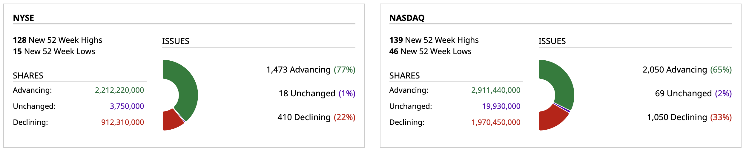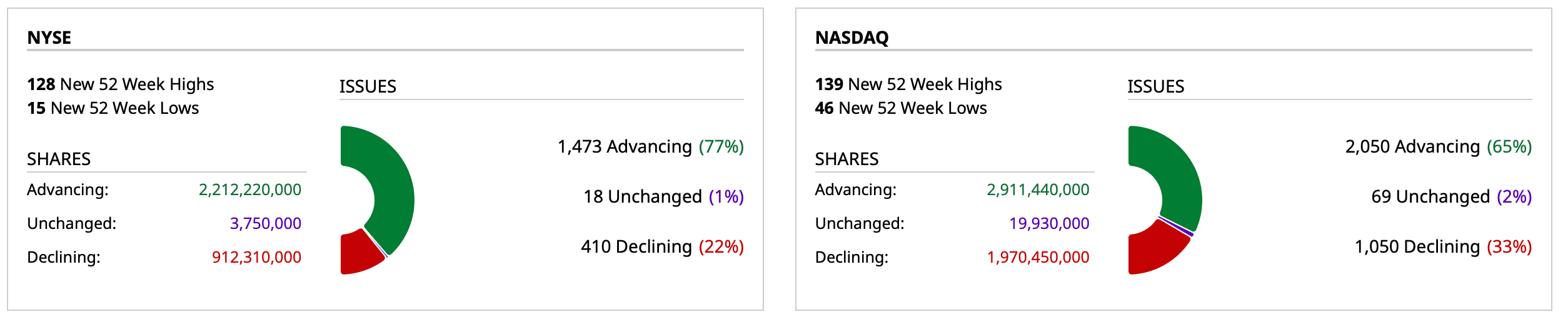 - Nasdaq volume 33% below its one-month average; -