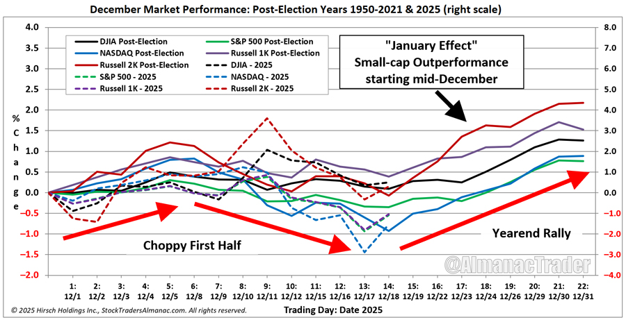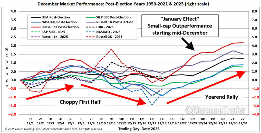 As of today’s close, DJIA and Russell 2000 are positive for December, up 0.49% and 0.30% respectively. NASDAQ has been the weakest, down 1.54% with tech-heavy S&P 500 and Russell 1000 also down just over 1%. It is also notable that this December’s NASDAQ and S&P 500 underperformance is consistent with past post-election years. Provided the market can hold today’s gains the second half of December rally has likely begun. Historically bullish week after quarterly options expiration (STA page 108) combined with holiday cheer (STA page 80) could propel the market higher through year end.
