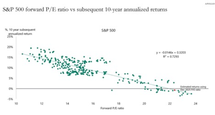 The chart indicates the relationship between starting valuations and subsequent 10-year market returns.