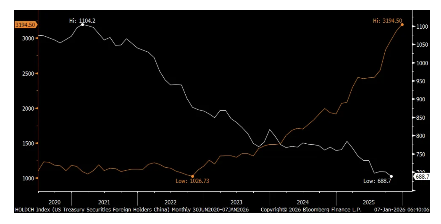 China further increased its holdings of gold in December and it continues to go in the opposite direction of their holdings of US Treasuries.