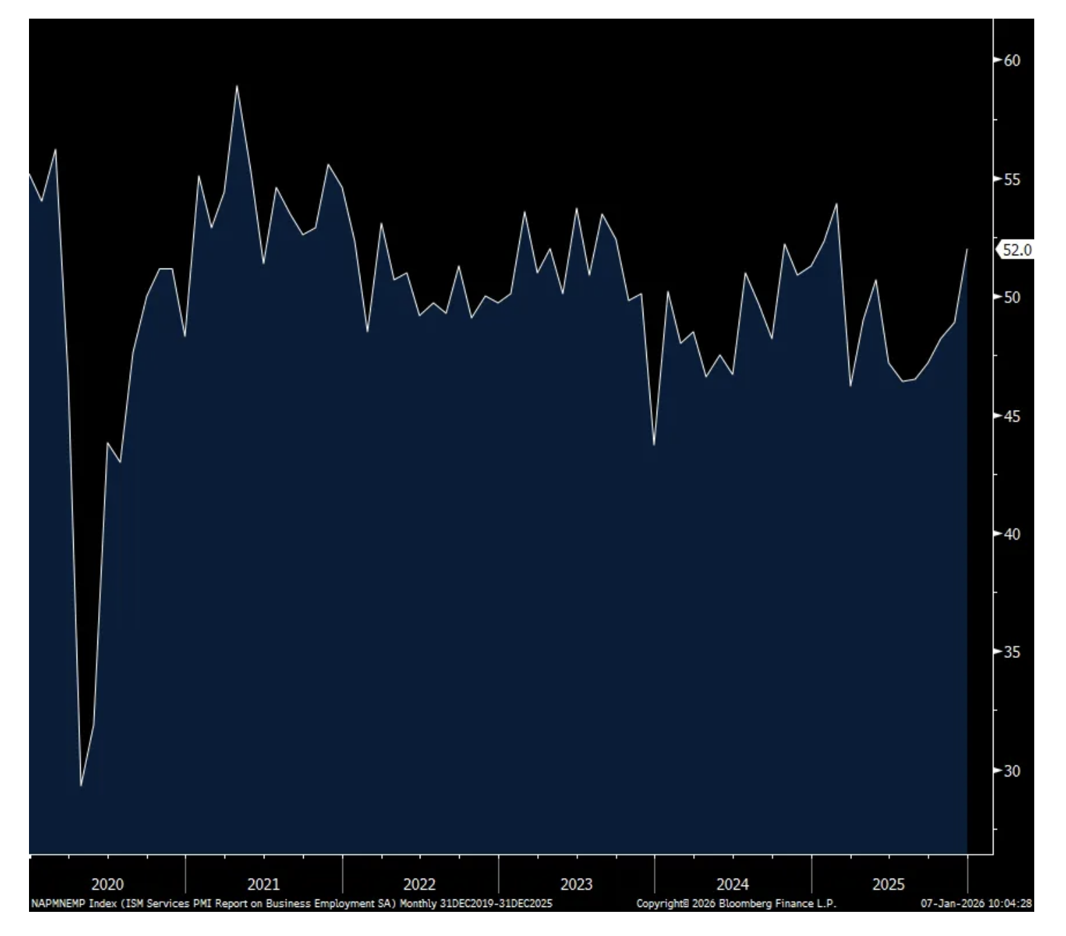 The December ISM services index rebounded to 54.4 from 52.6, above the estimate of 52.2 and the best since October 2024. ISM said “Tariff impacts and seasonality were common themes among panelists’ comments.” While the Business Activity component rose to 56 from 54.5, only 9 industries of 18 saw an increase vs 11 in November.