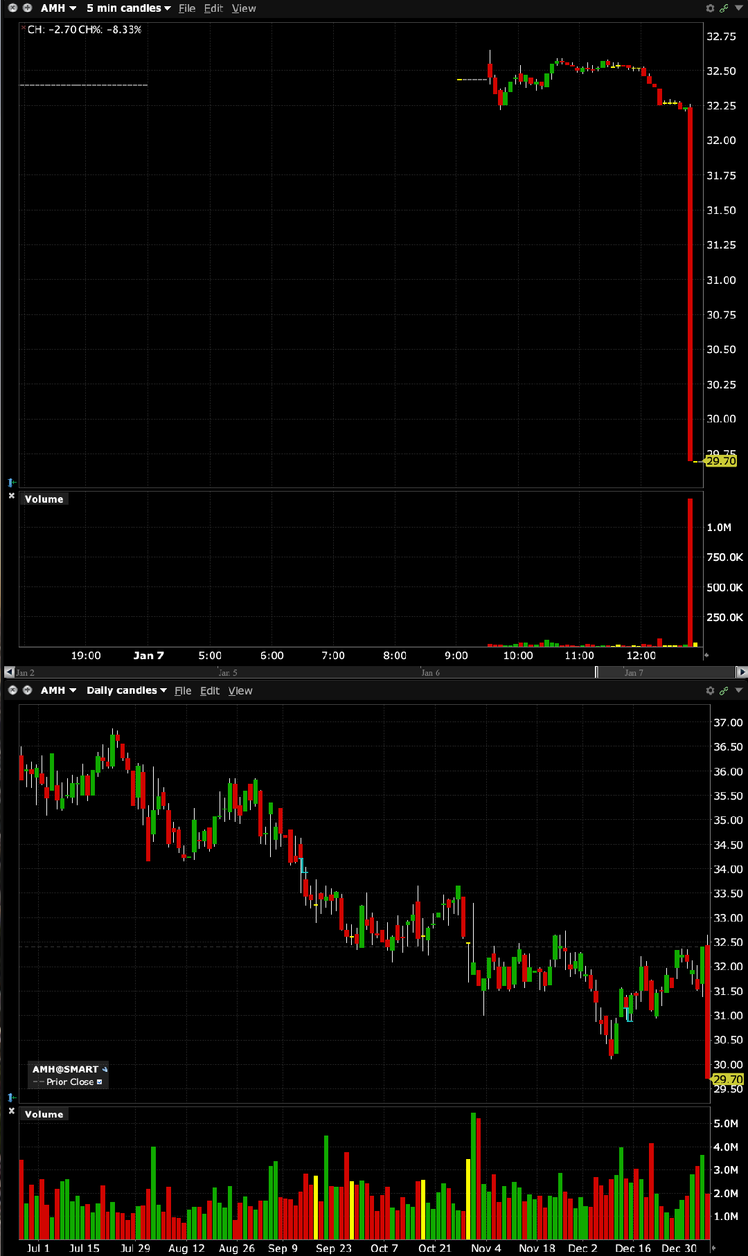 A speculative short that I have had in my portfolio — American Homes 4 Rent (AMH) — is getting hit on the Trump news prohibiting institutional purchases of residential homes: