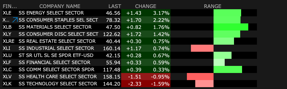 There's been an abrupt change in market leadership consistent with my high-tech cautiousness/concerns (expressed in this morning's chart) — with Staples ( (PG) , (KMB) and (PEP) ) leading the pack.