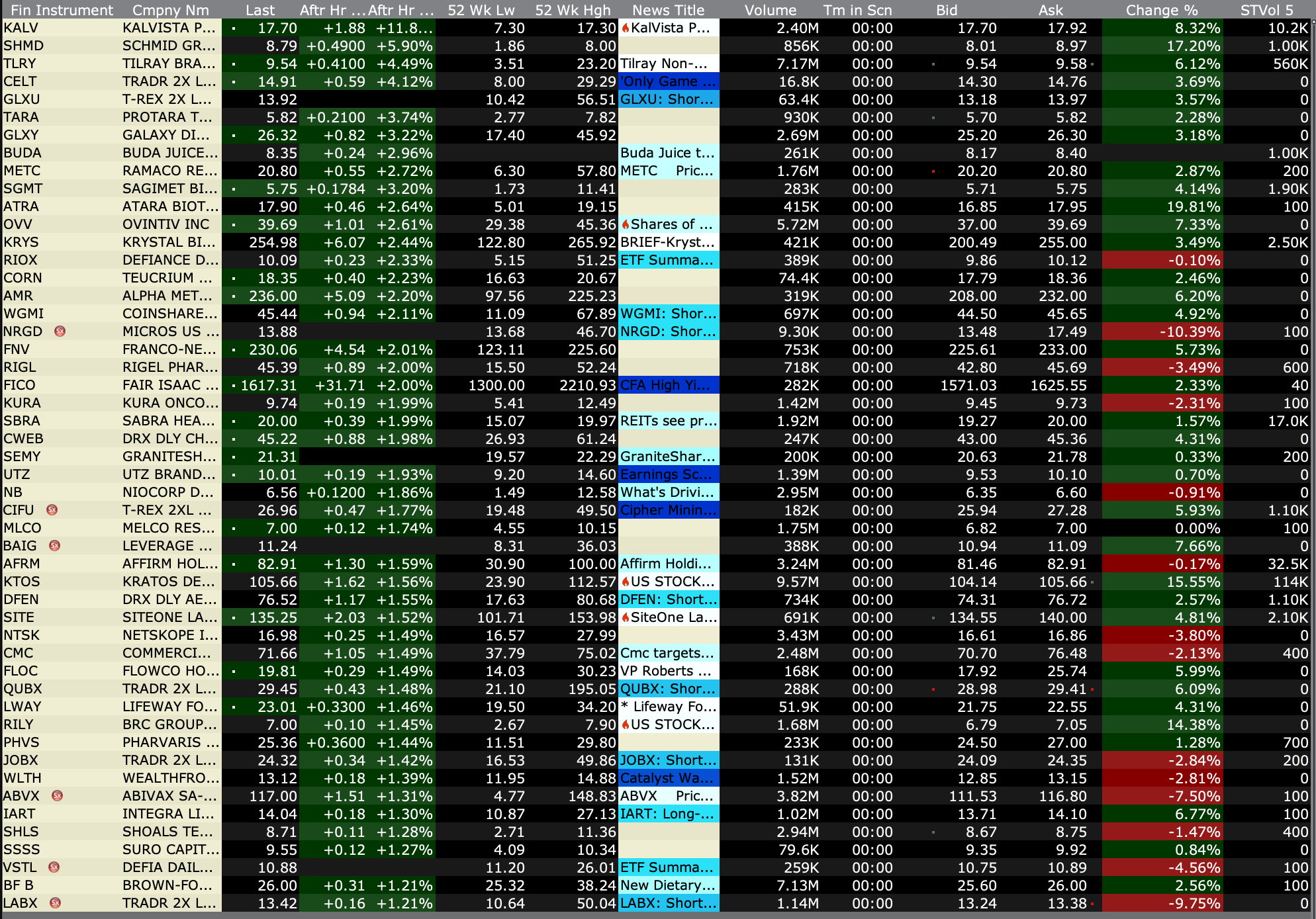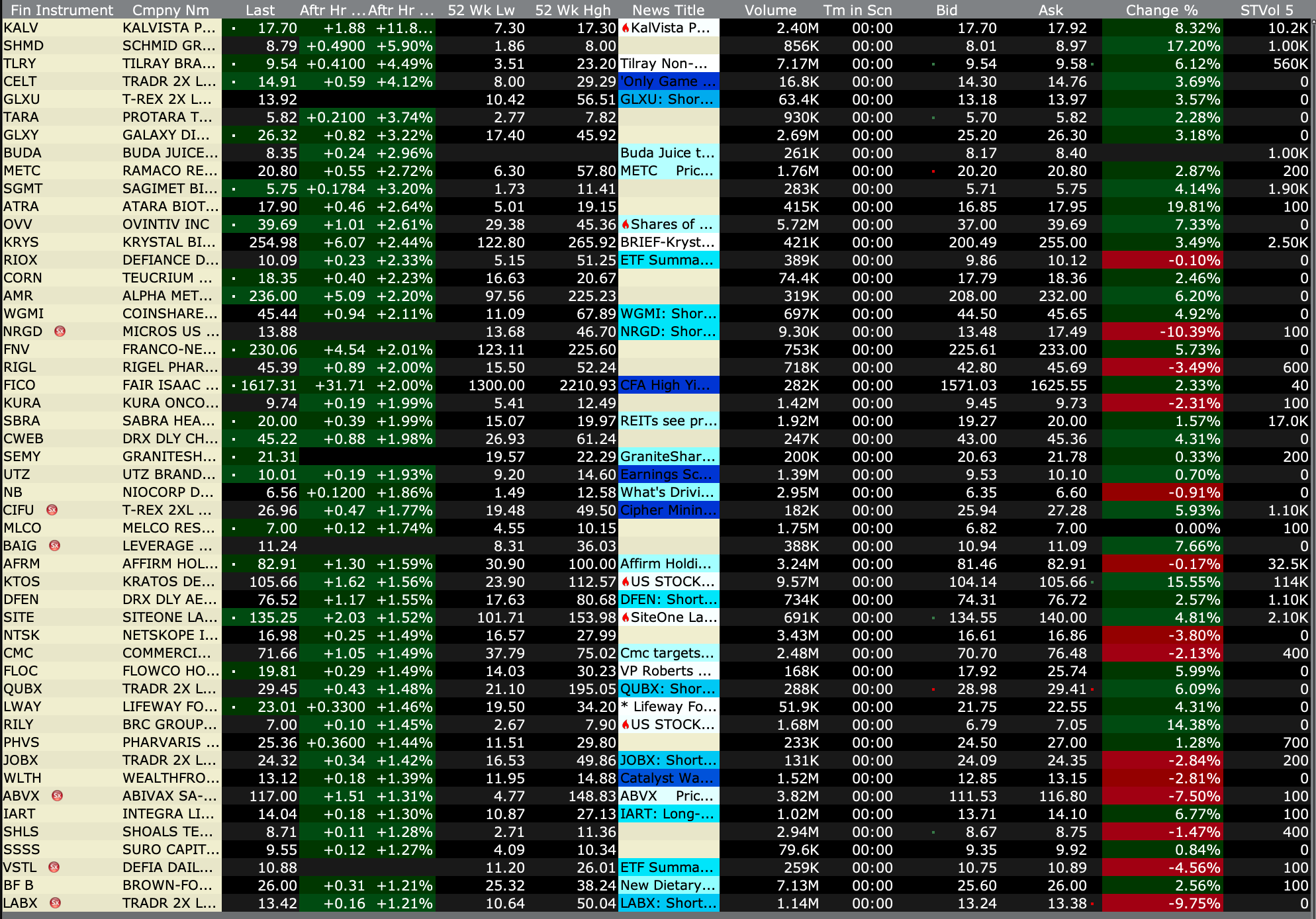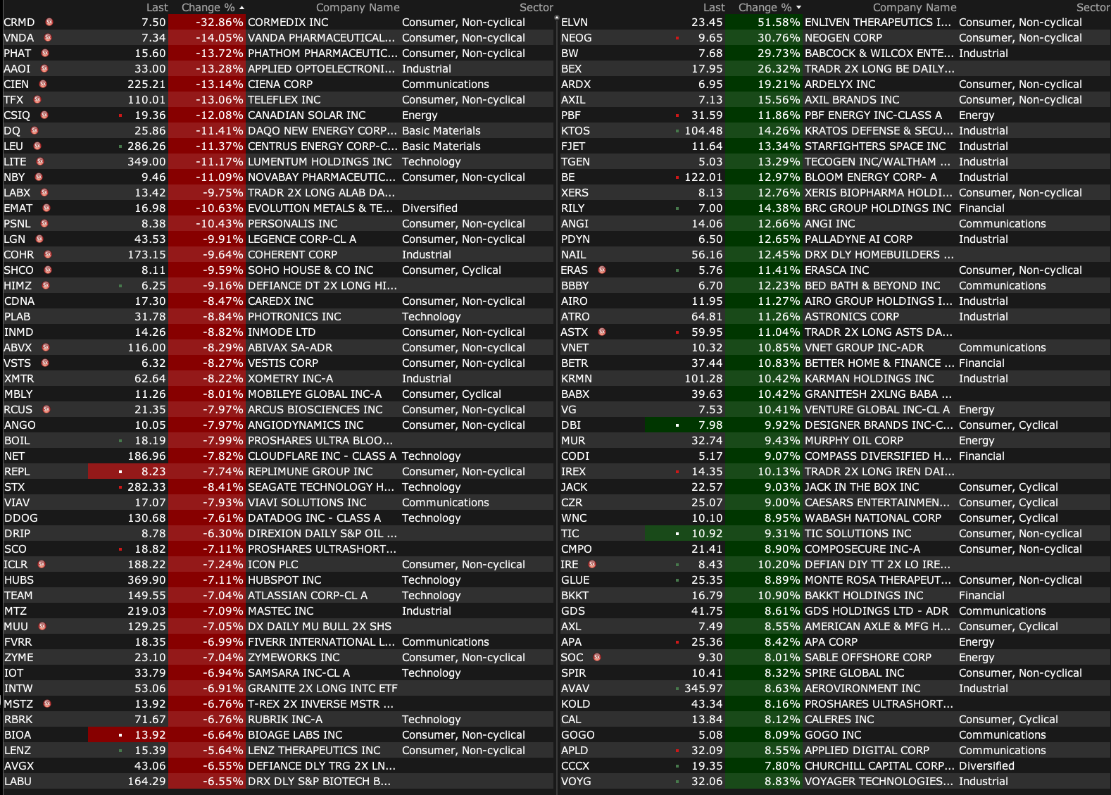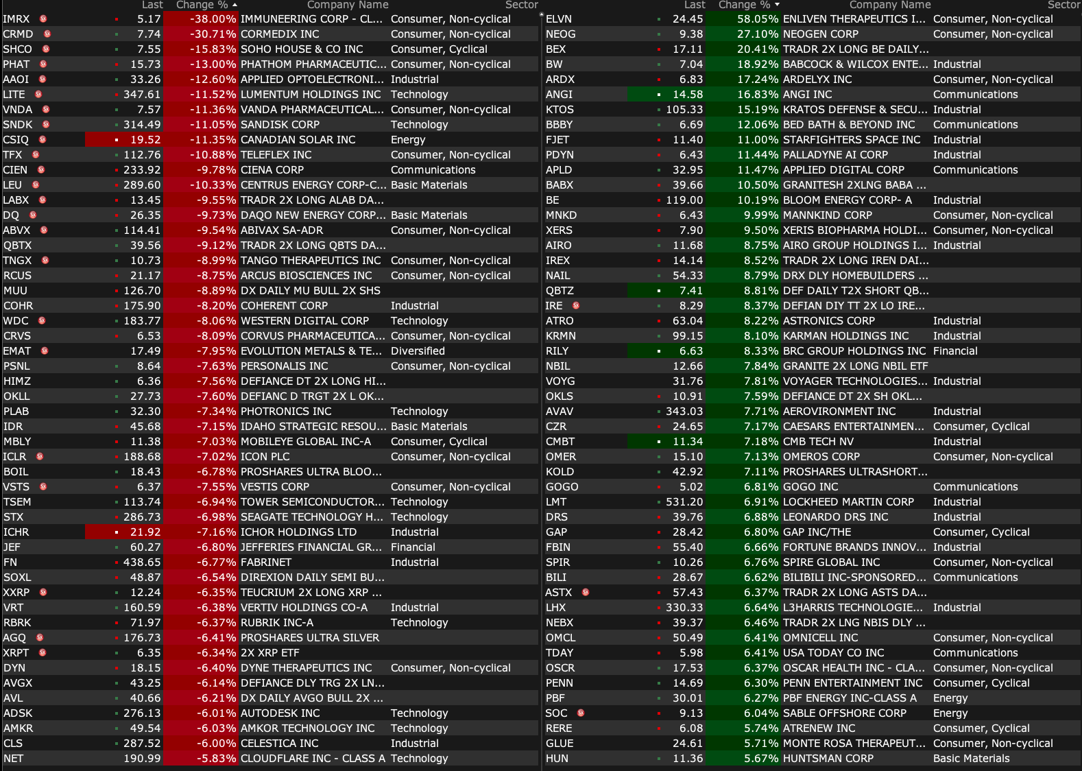 -MLTX +36% (announces positive outcome from Type B Meeting with U.S. FDA with Topline results from SUNRISE-PD Trial expected in 1H26 with plans for BLA submission for SLK in HS in 2H26)