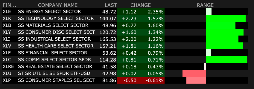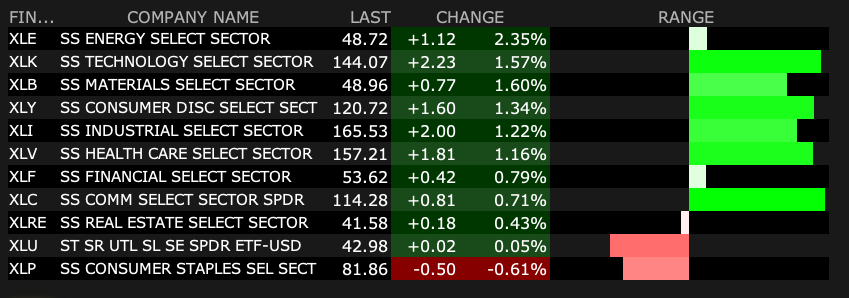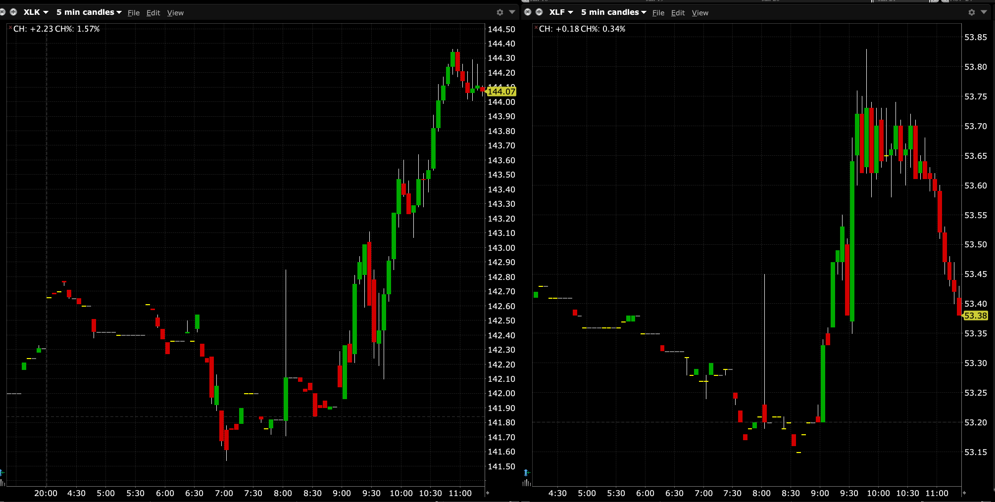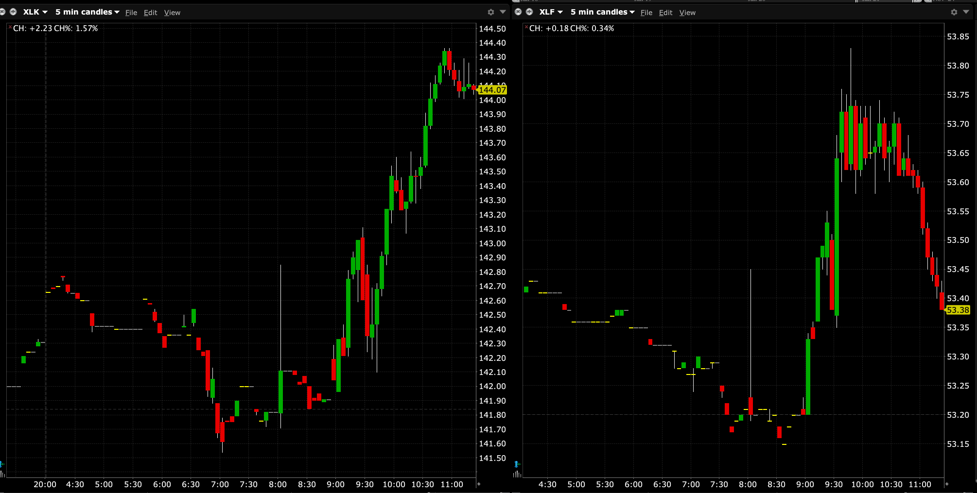 Look at the intraday charts of the Tech ETF (XLK) and compare it to the Financials ETF (XLF) below.