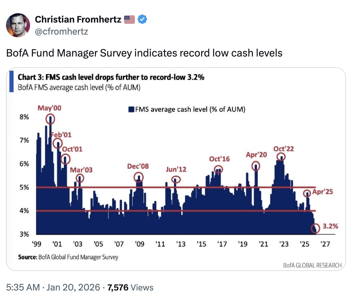 The BofA Fund Manager Survey indicates record low cash levels: