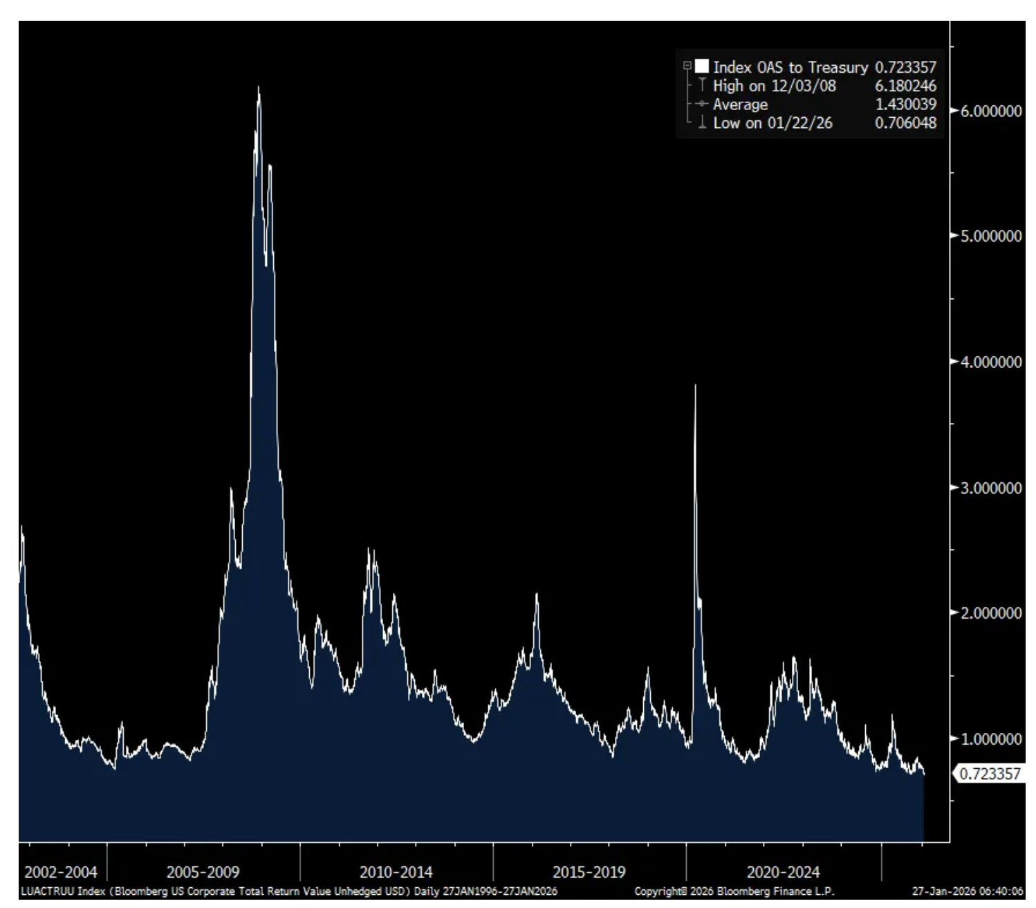 I wanted to point out that on Thursday, the US corporate investment grade bond spread tightened to just 70 bps (closed yesterday at 72 bps). I have data back to 2001 and it’s never been this tight. It says as much about the expensive nature of corporate bonds but also what investors think about holding US Treasuries relative to corporates. I guess would you rather hold the bonds of Coca Cola and Walmart or the US government with the market obviously voting for the former right now.